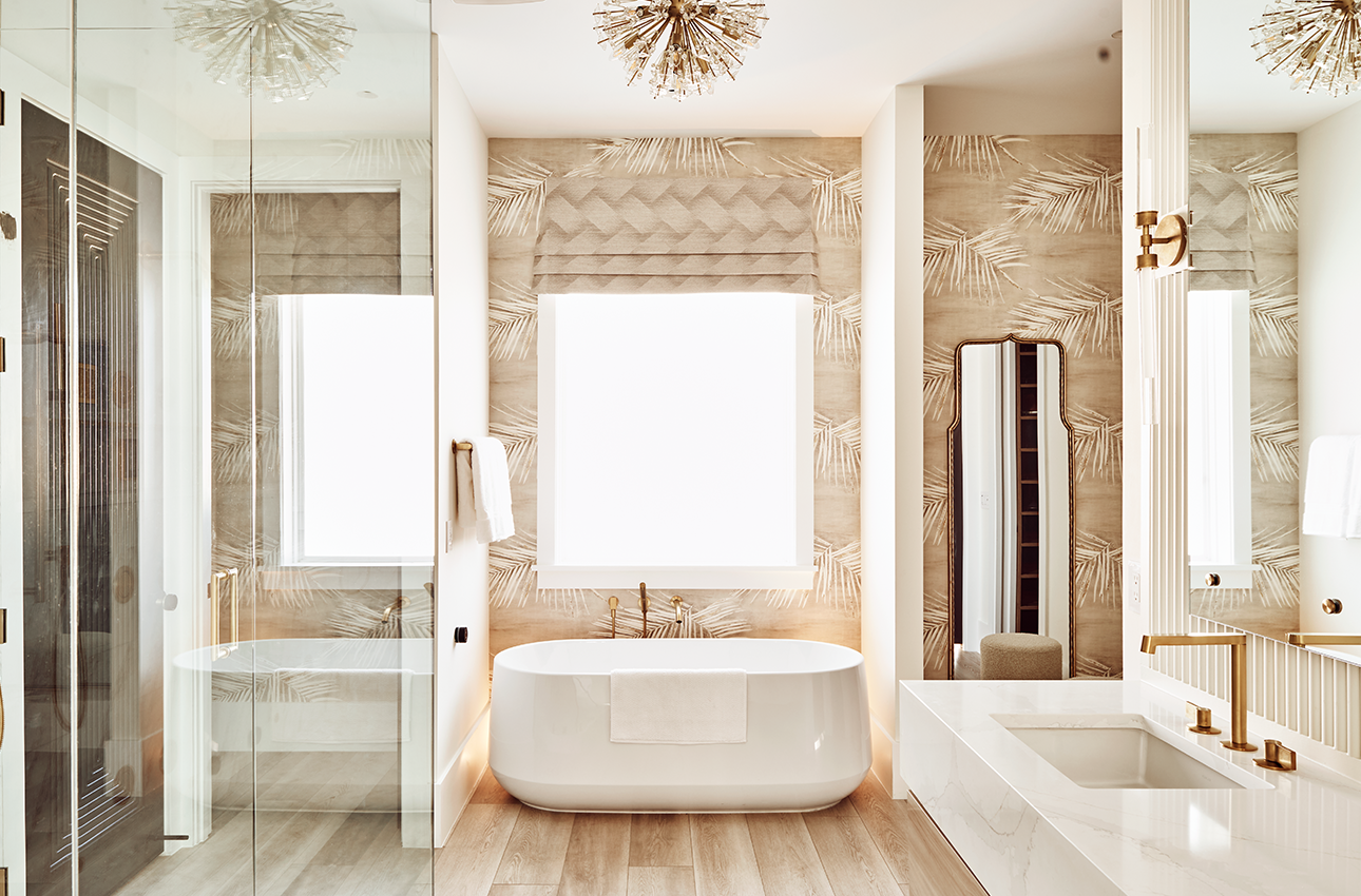 Calming tones and coastal-inspired wallpaper combined with sculptural silhouettes and warm, brass undertones leave a brilliant, tranquil effect in the primary bathroom.