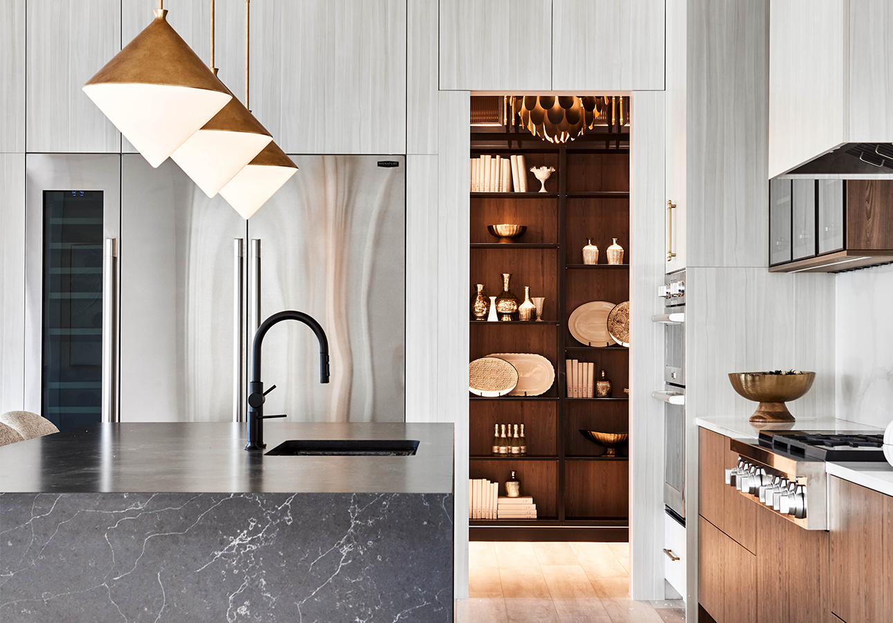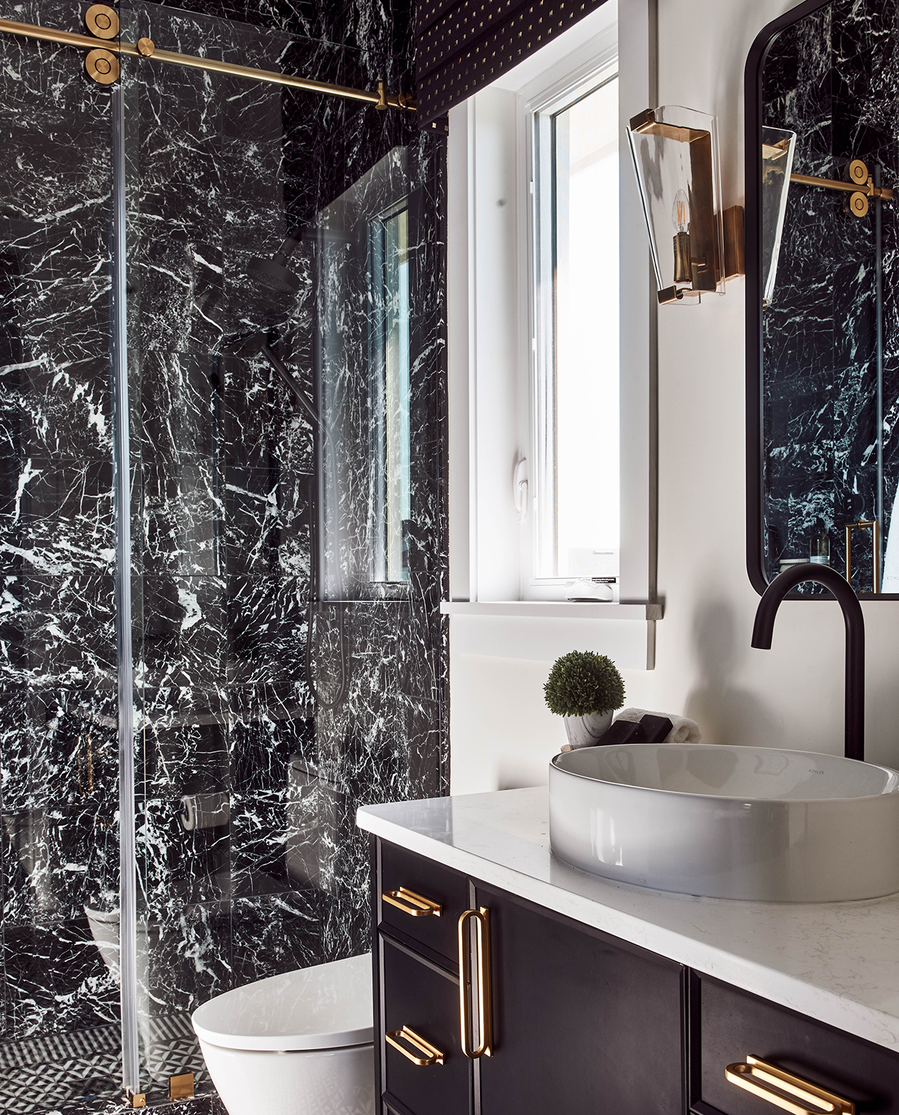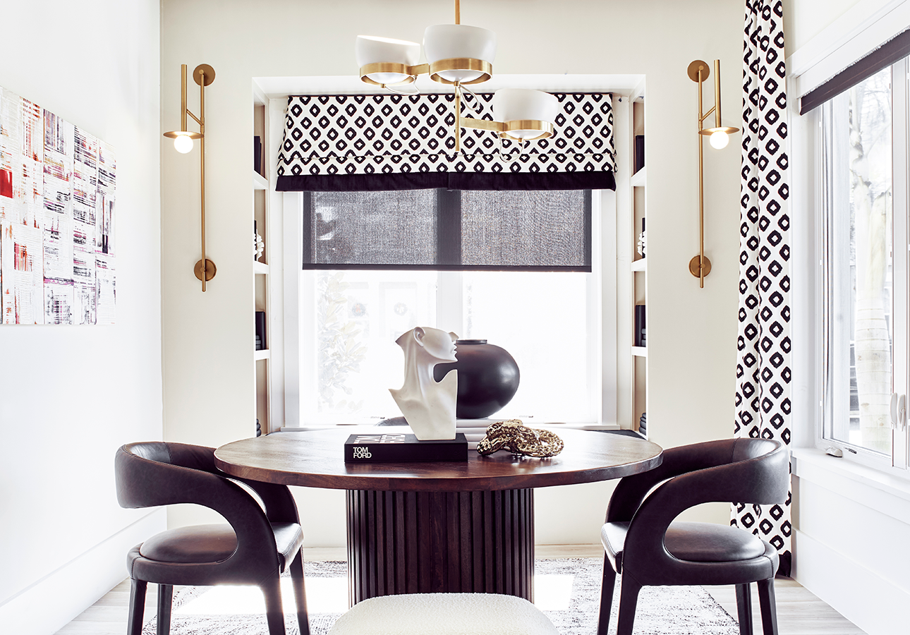 Full of eye-catching yet minimalist touches, Johansen transformed the dining area with a visually arresting installation of Verso Mini Single Pendants by Kelly Wearstler sitting atop an array of earthy table décor with shades of cream galore. On the right, the dark marbled walk in shower instantly adds mood, while the simplicity of the vessel sink and brass detailing of AERIN's Alpine Small Single Sconce and vanity knobs add warmth and familiarity.