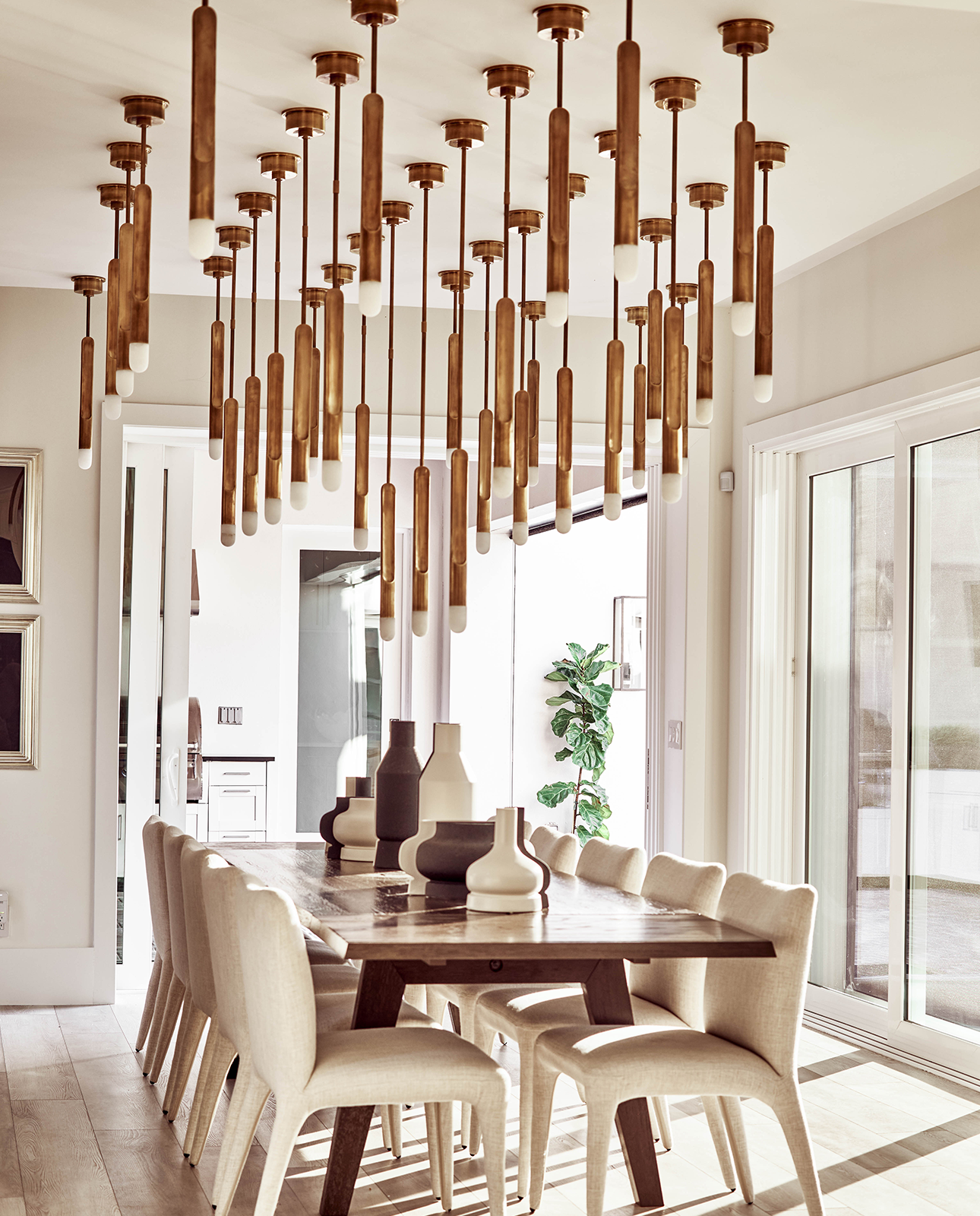 Kelly Wearstler's Strada Ring Chandelier in gild adds a glam touch to the intimate living room, where telescoping patio doors open to the courtyard pool.