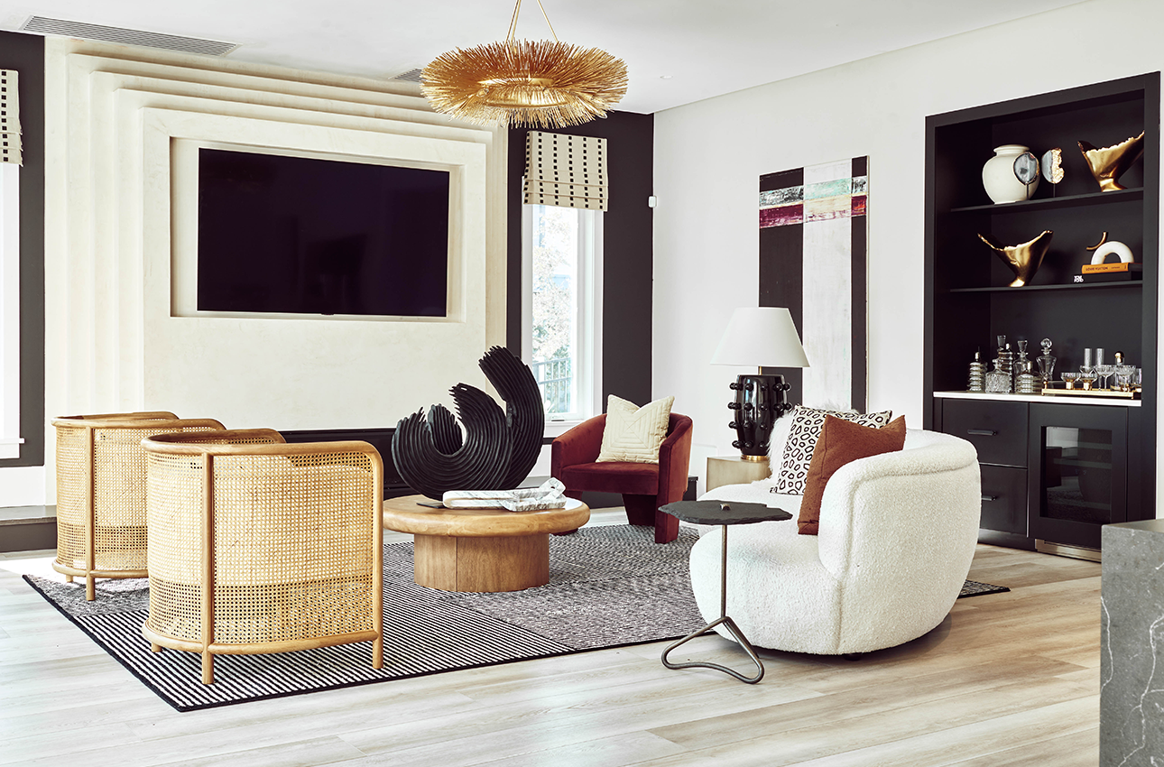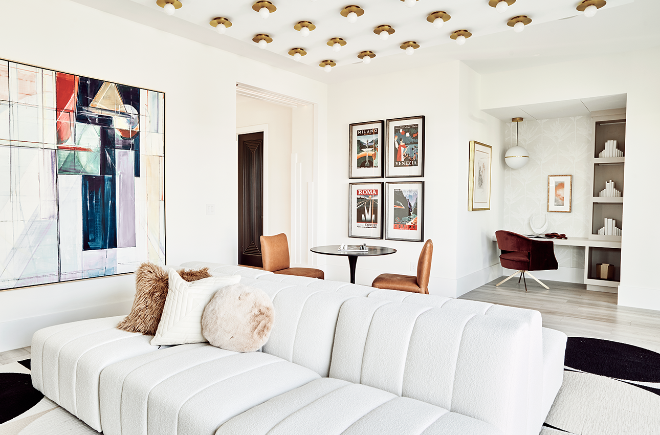 The game room on the second floor features a flex space, courtesy of sectional sofas and accent tables, punctuated by a playful lighting installation. A decorated nook beneath Sean Lavin's Hanea Grande Pendant provides privacy.