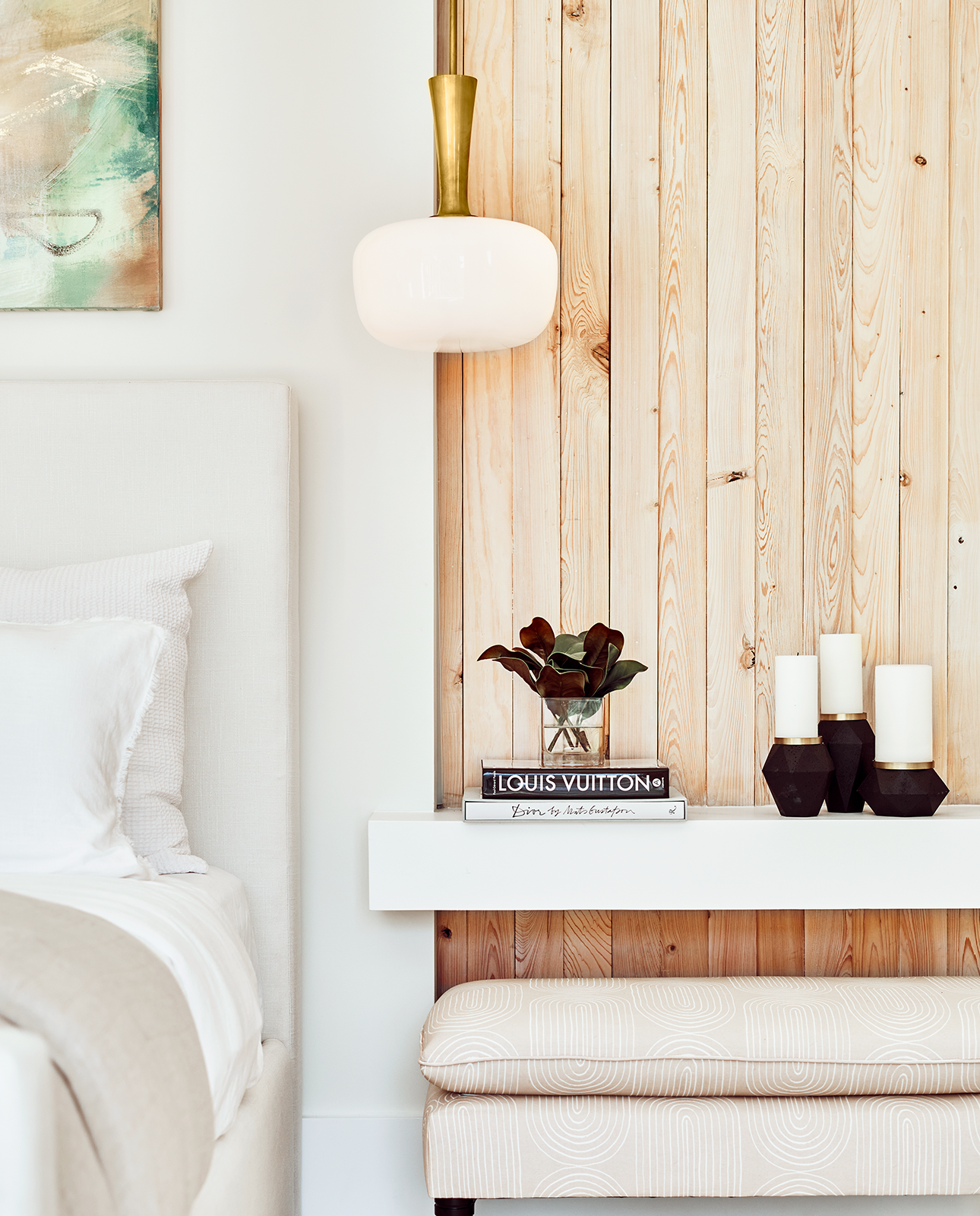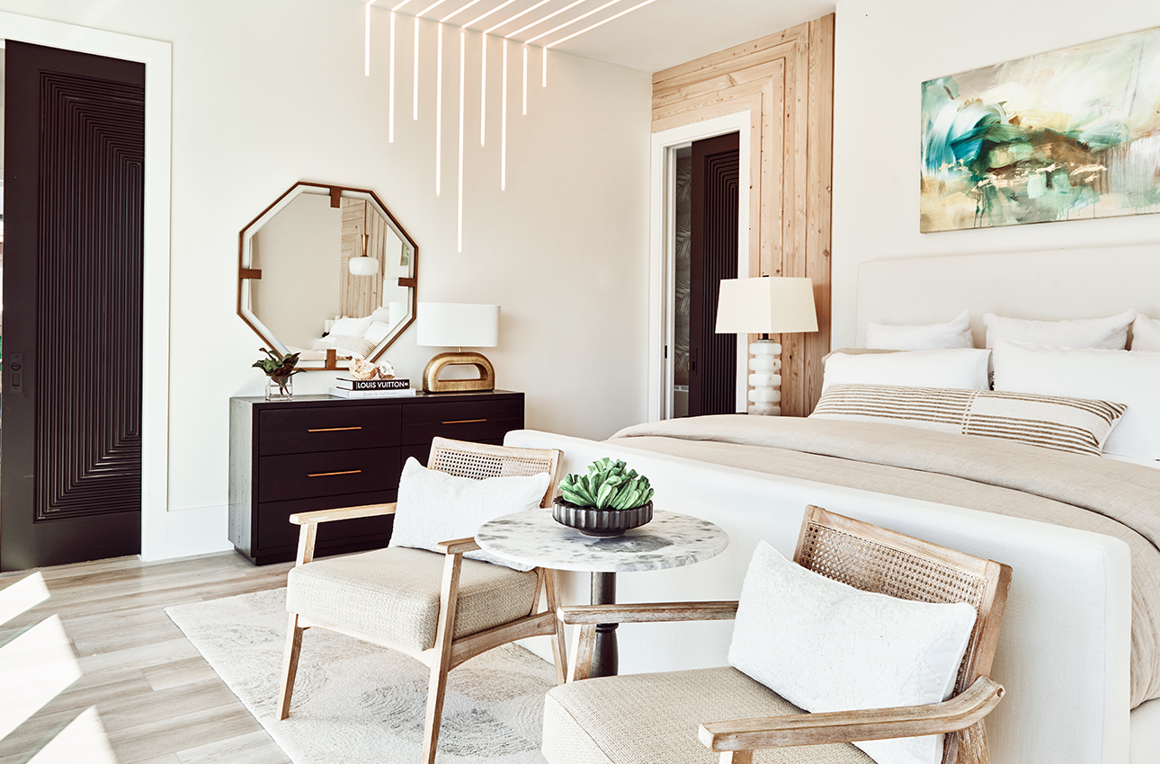 "It was paramount that the primary bedroom feel like a private oasis," Johansen said. "The lighter coastal tones hit the sweet spot." Combining light washed wooden accents with dark detailing, brass finishes and soothing, yet eye-catching artwork make this primary bedroom feel like a safe haven.