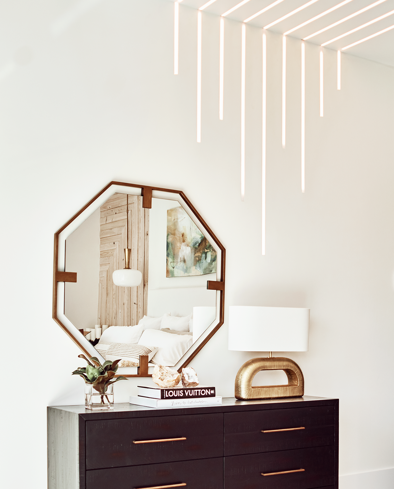 Inset lighting drapes from the ceiling to the wall in the primary bedroom, adding a crafty modern element to the home's art deco-meets-coastal vibe.
