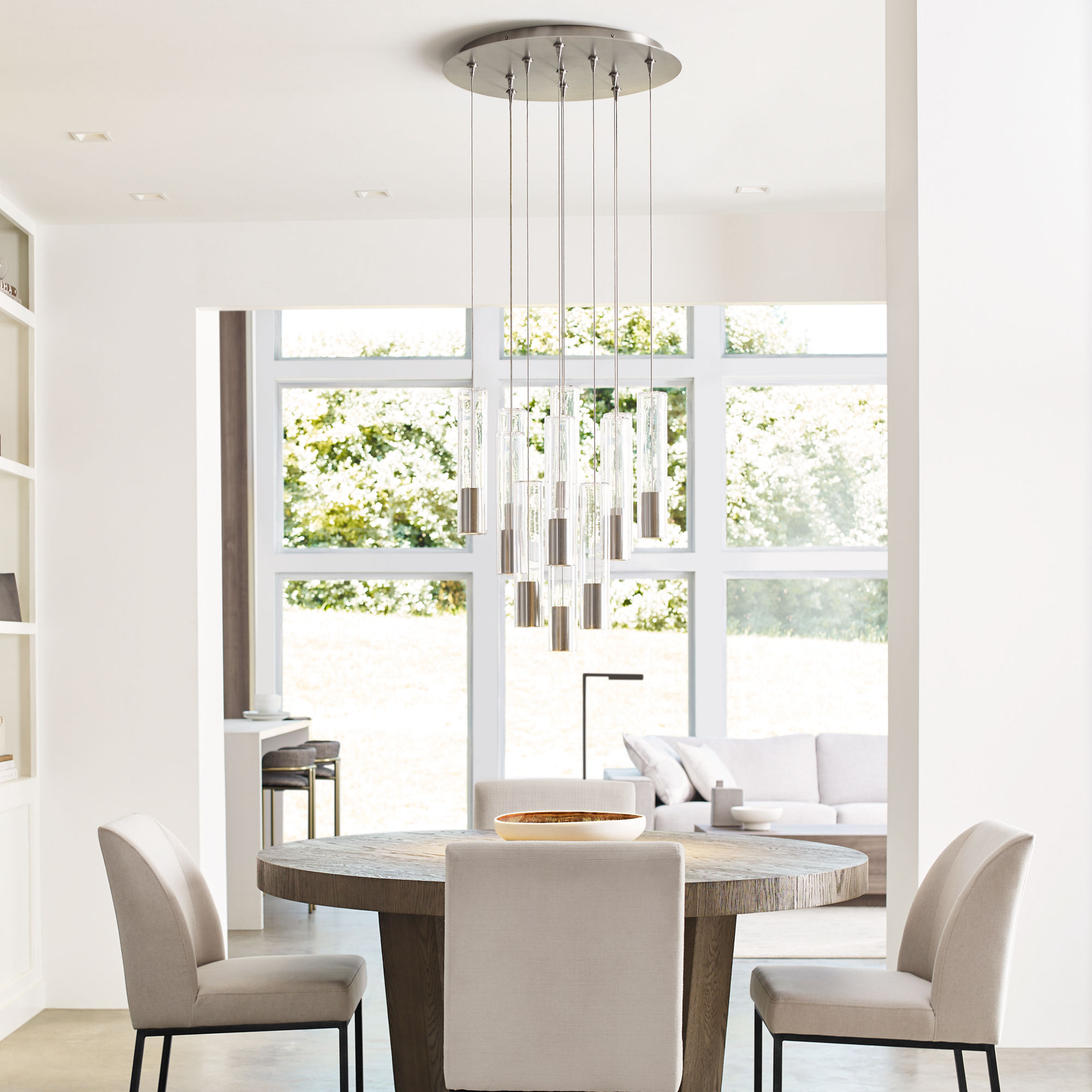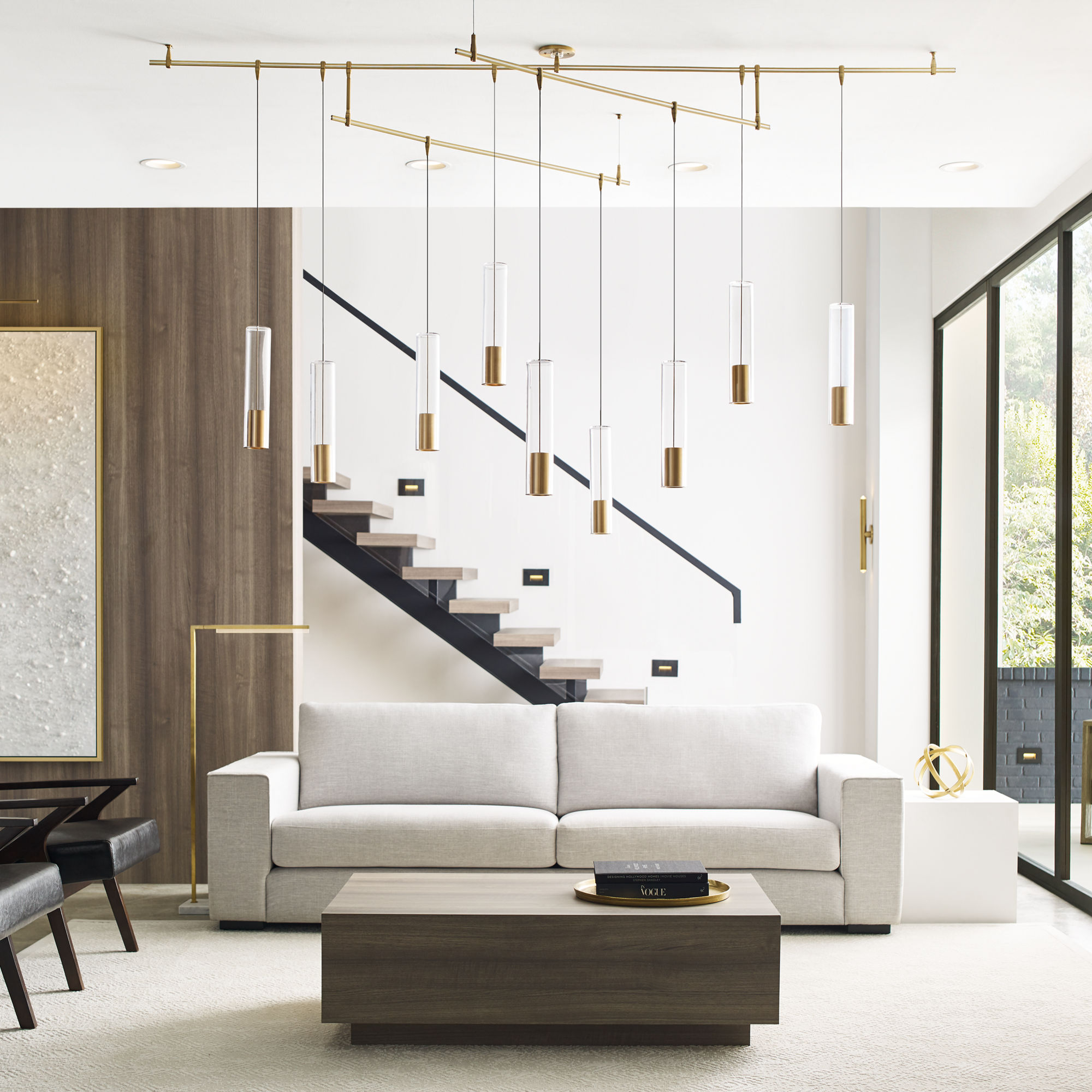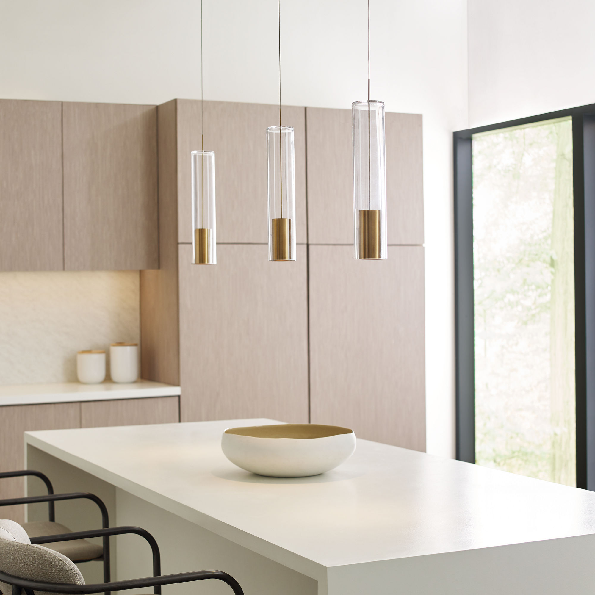 The Captra pendant light by Sean Lavin features a meticulously detailed metal spinning that outlines the fixture's light engine and is captured inside a clear casing to create a strikingly contemporary cylindrical pendant. Available in modern on-trend finishes. Scaling at 14 in. in length and 3 in. in width the Captra is ideal for kitchen island task lighting, dining lighting and hallway lighting. Combine the Captra with any of our multiport canopies to create a customized chandelier that is specifically designed to your unique space. Your choice of energy efficient LED lamping ships with the Captra to save you time and money. All lamping options are fully dimmable to create the desired ambiance in your special space.