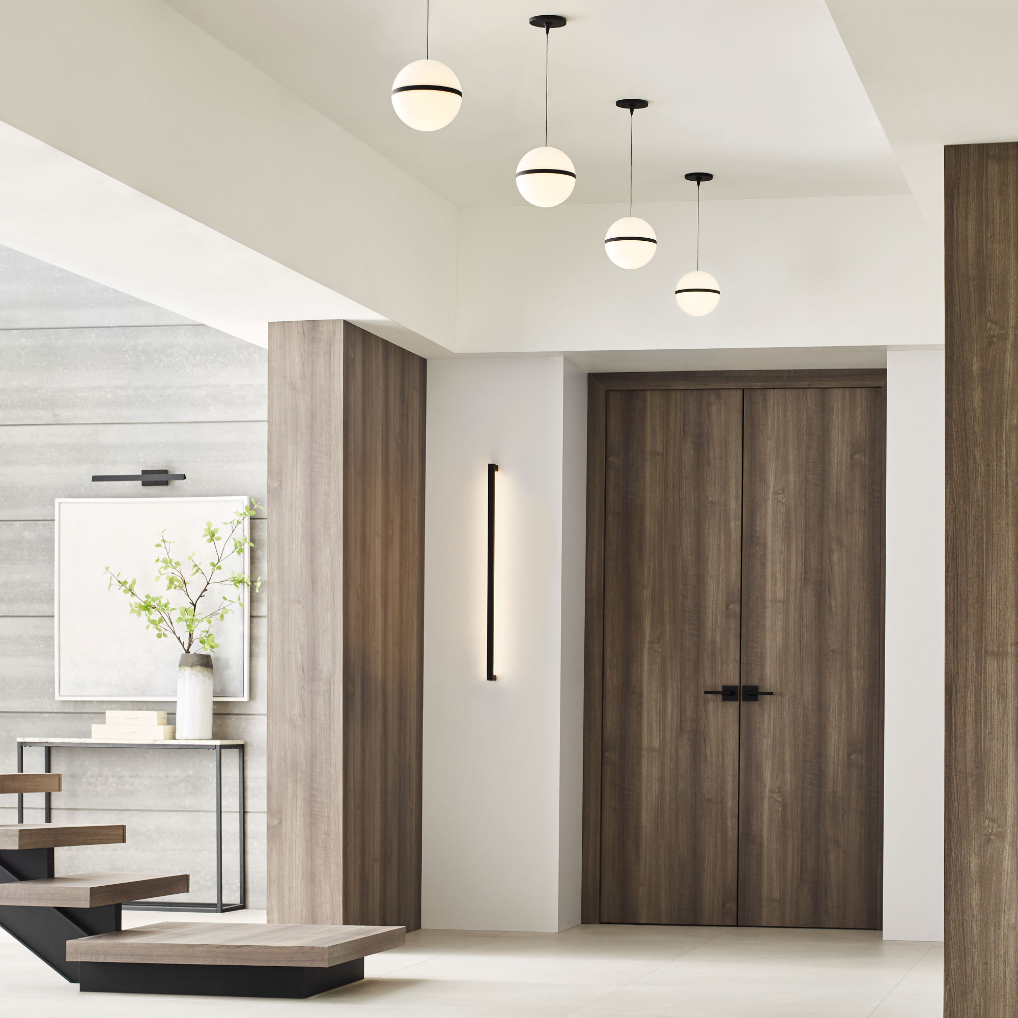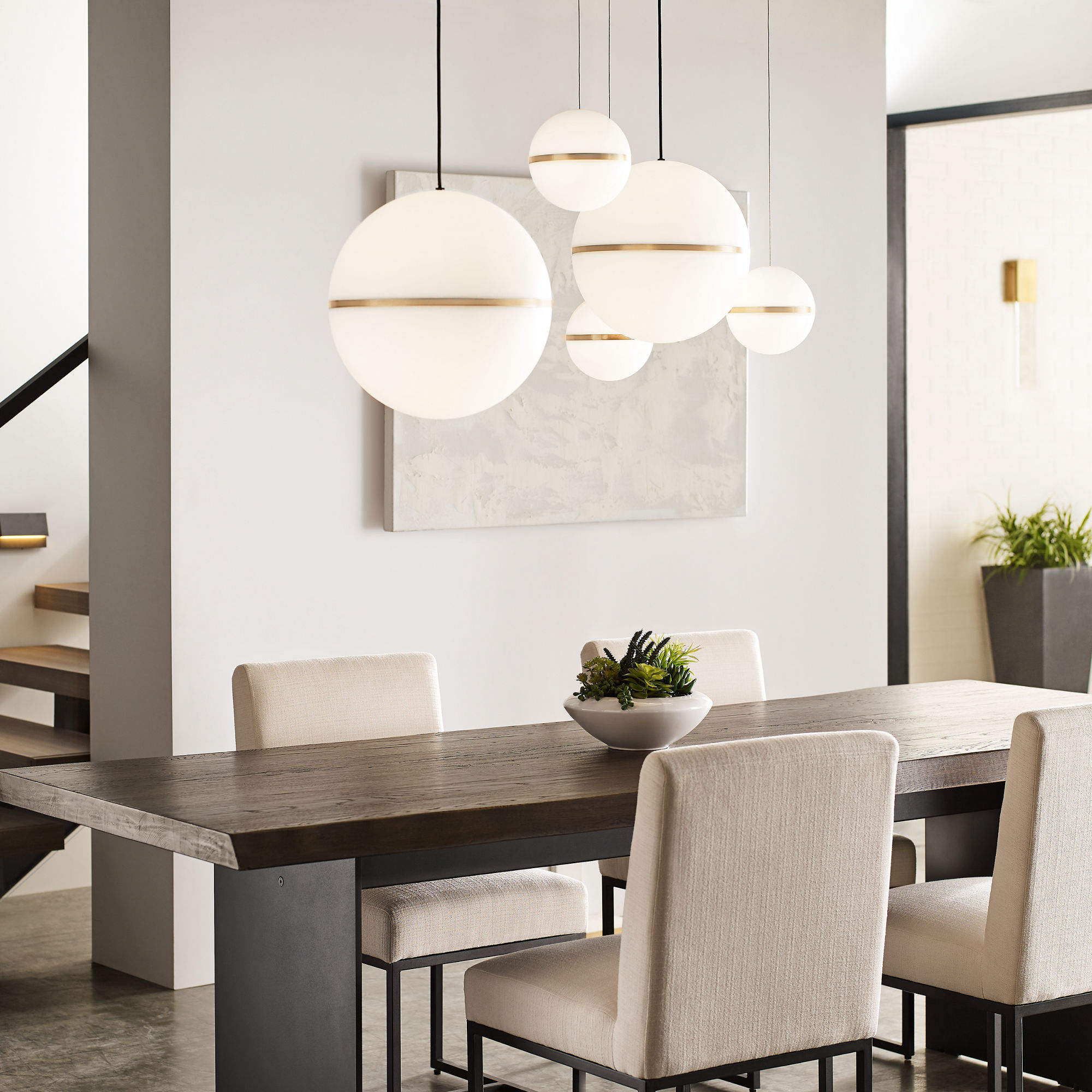 Inspired by mid-century design, the Mini Hanea Pendant by Sean Lavin celebrates the popularity of spherical geometry with an acrylic shade accented by a thin band in three finish options. Available in modern finishes, this pendant is beautiful when clustered in multiples or as a stand alone fixture. Low-Voltage pendants are great solution as individual pendants and complement our VC Modern MonoRail Track System. Available as Line- or Low-Voltage Pendants.