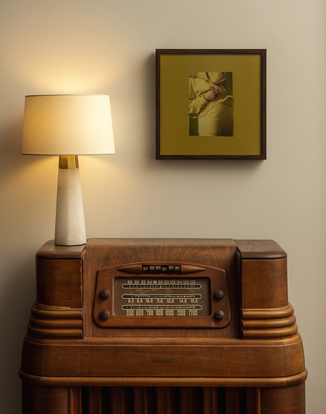 Vintage charm — like this retro radio-turned-console — doesn’t always come with an outlet. A cordless style, like the Olsen 15" Cordless Accent Lamp by AERIN, brings light to every corner. Interior design by Kim Lewis.
