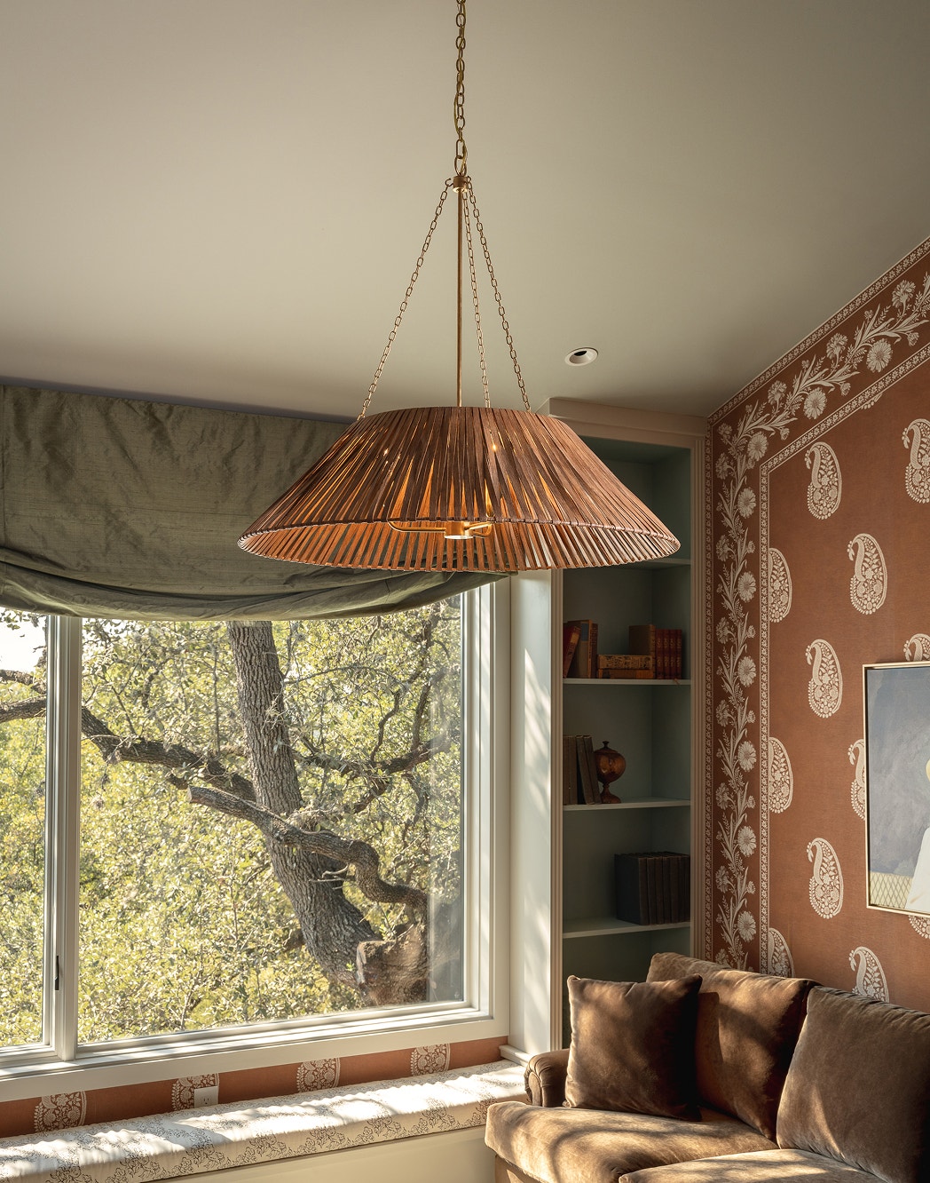 The guest suite’s eye-catching wallpaper calls for warm tones and natural finishes. The Corrine Extra-Large Wrapped Hanging Shade by Marie Flanigan is a polished choice that quietly nods to eclectic, bohemian style. Interior design by Leah O’Connell.