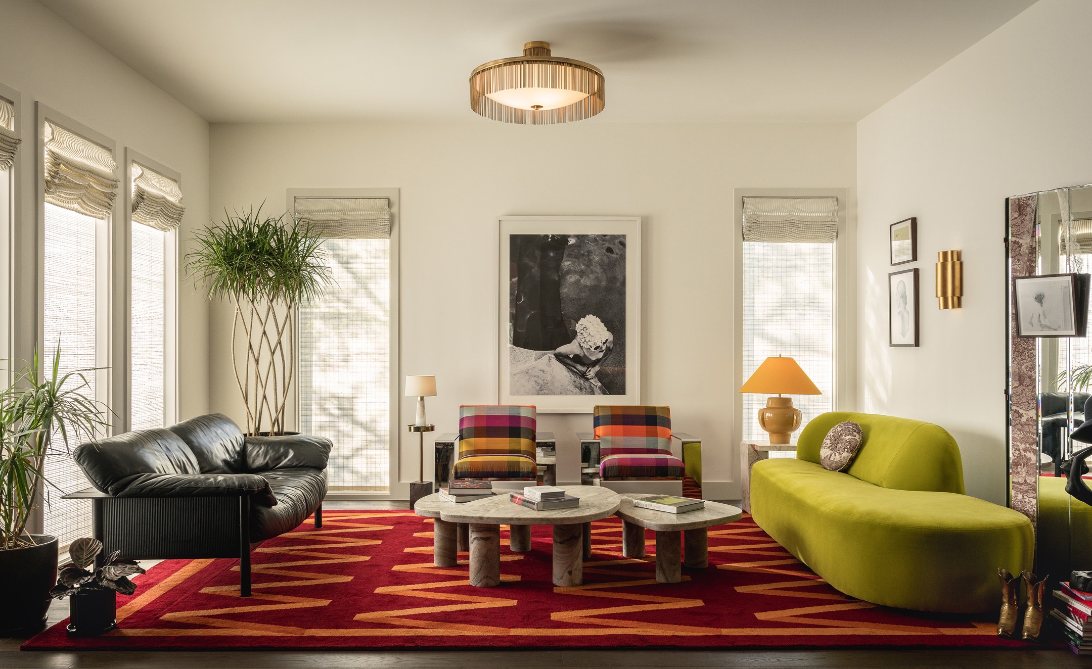 The Sutton 32" Flush Mount by Fisher Weisman, Cap-Ferrat 26" Table Lamp by Thomas O’Brien and Arabelle Medium Sconce by AERIN illuminate bold color in the home’s mid-century-inspired living room. Interior design by Kim Lewis.