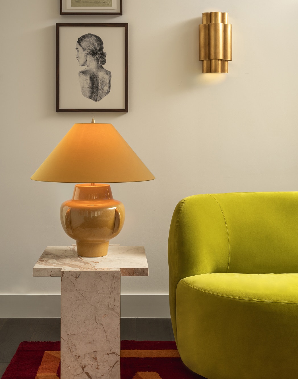 The Cap-Ferrat 26” Table Lamp by Thomas O’Brien is a work of art in itself when placed on a marble pedestal. The Arabelle Medium Sconce by AERIN adds a glowing touch. Interior design by Kim Lewis.