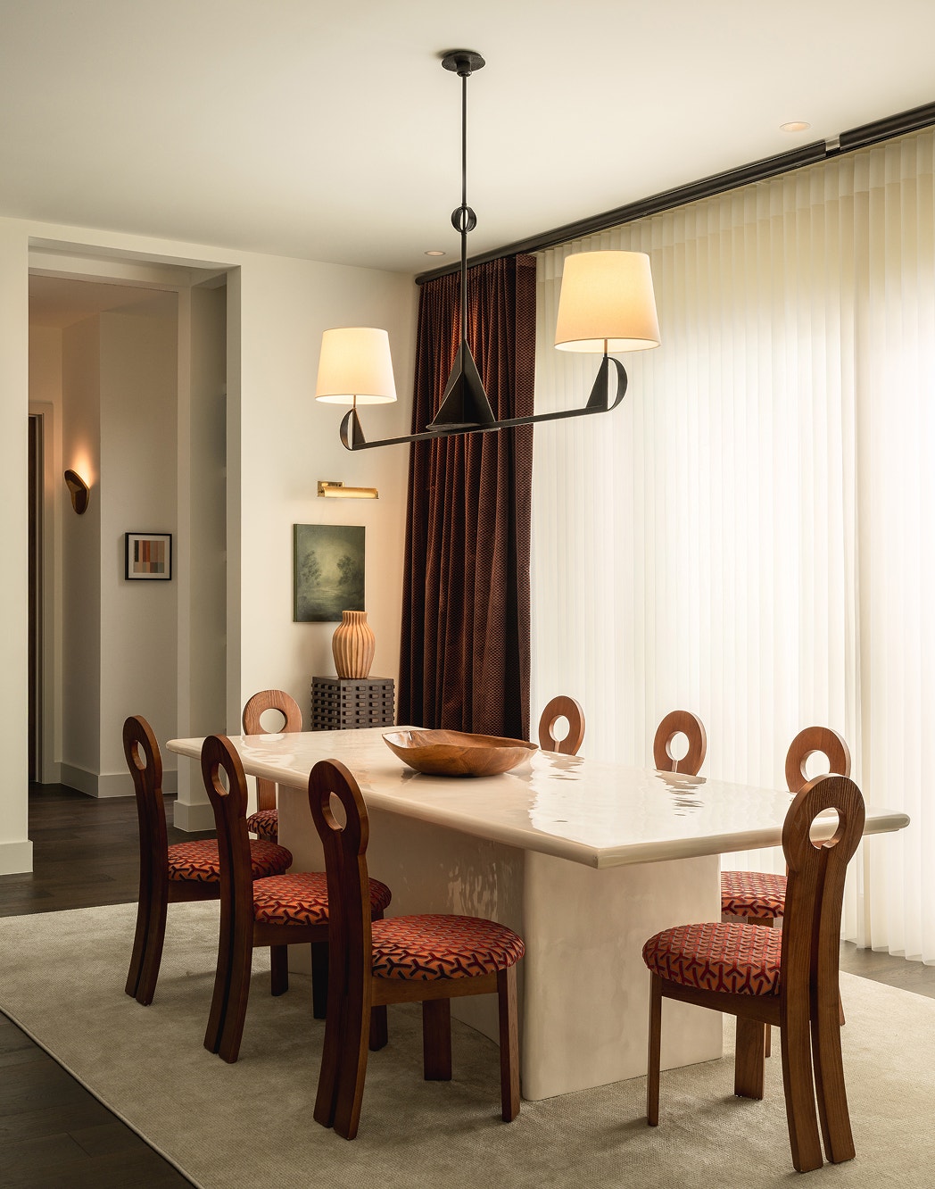 In the dining room, decidedly modern chairs are anchored by a contemporary chandelier, the Auxerre Extra Large Blacksmith Linear Chandelier by Thomas O’Brien. Custom automated shades from Visual Comfort & Co. allow for ample light — or total privacy — at a moment’s notice. Interior design by Kim Lewis.