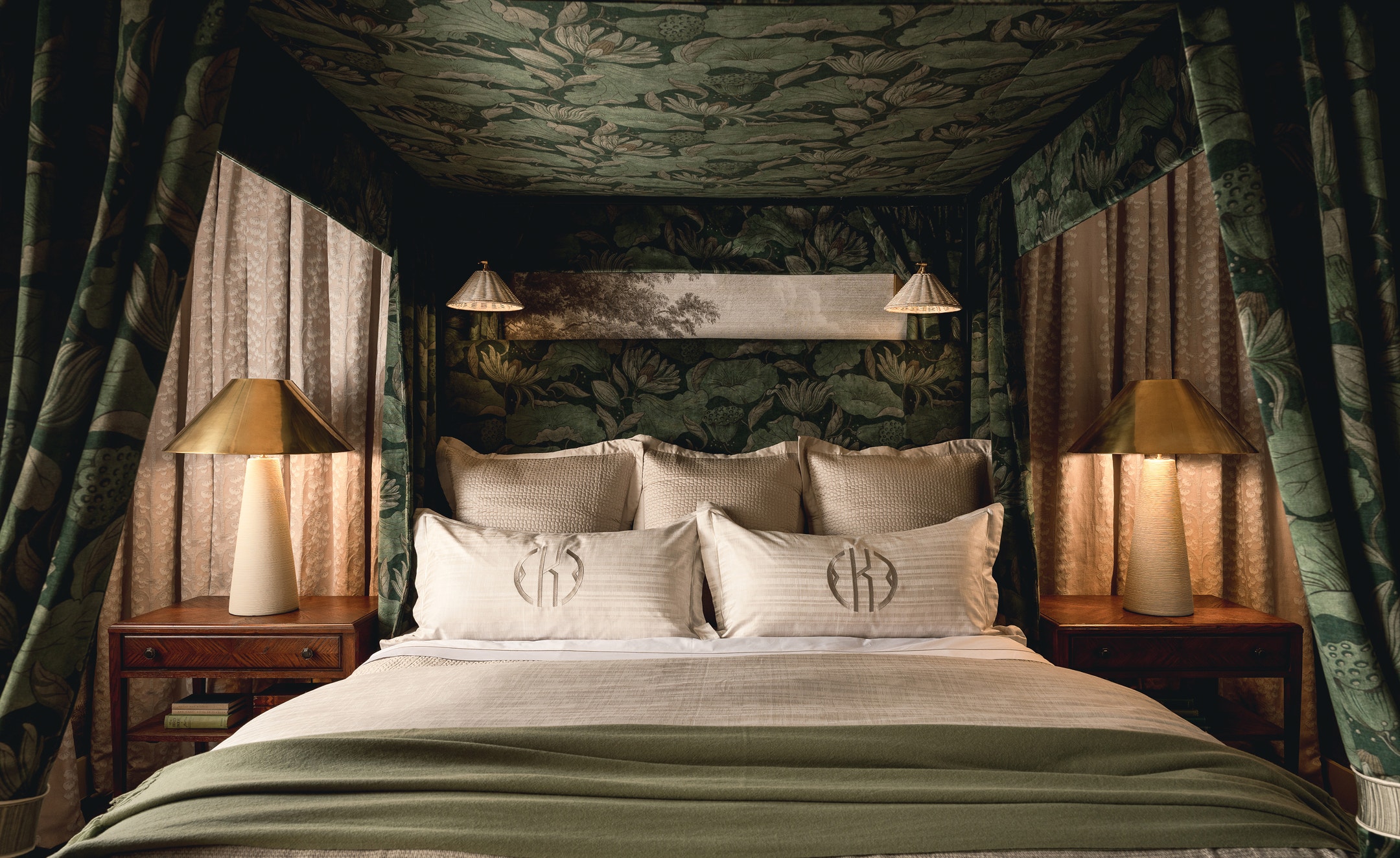 Tucked inside the four-poster bed, a pair of the Wimberley Single Arm Sconce by Marie Flanigan are a major upgrade to reading lights. Interior design by Kathy Kuo.