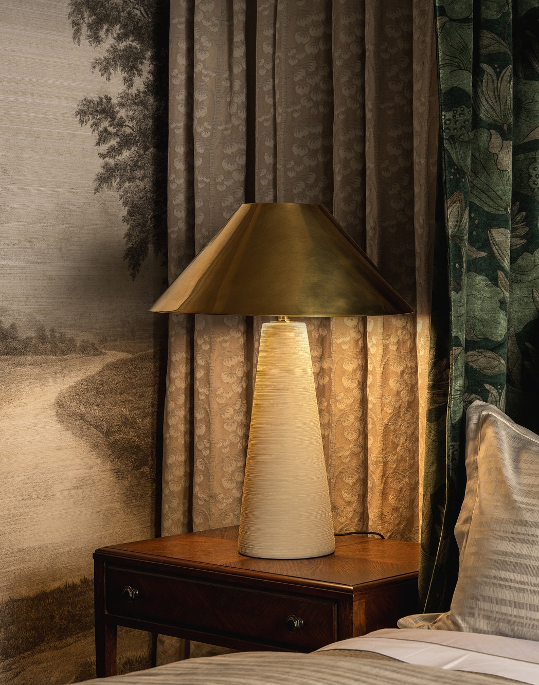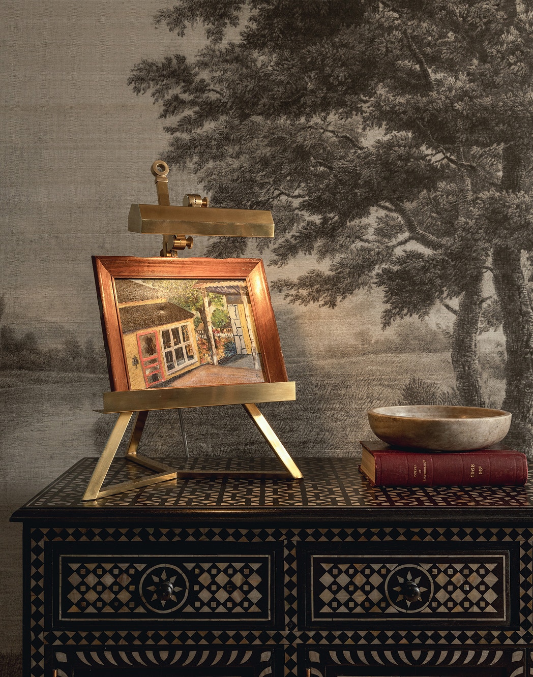 In the bedroom, even the smallest vignettes are worth a closer look. Here, the Estelle Display Lamp by Alexa Hampton spotlights a miniature work of art, set against the richly detailed Vista wallpaper by Phillip Jeffries. Interior design by Kim Lewis.