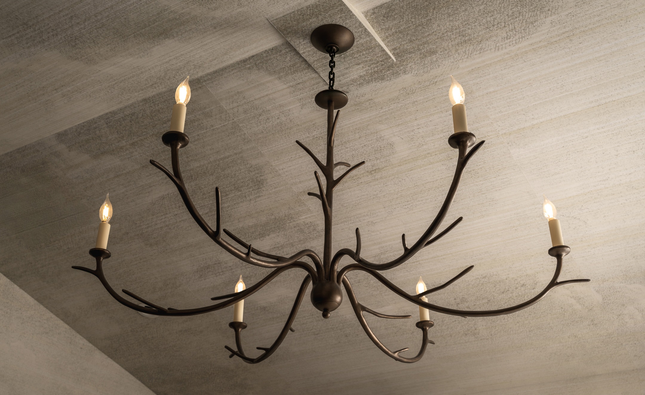 Branchlike arms in the Iberia Large Chandelier by Julie Neill extend the serene, nature-inspired motifs throughout the primary bedroom. Interior design by Kathy Kuo.