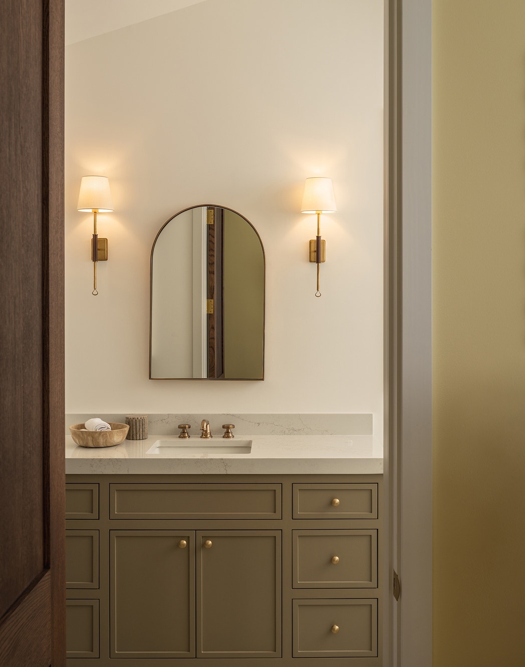Simple sconces — the Griffin Tail Sconce by Amber Lewis — flank the mirror in this serene guest bath. Interior design by Amber Lewis.
