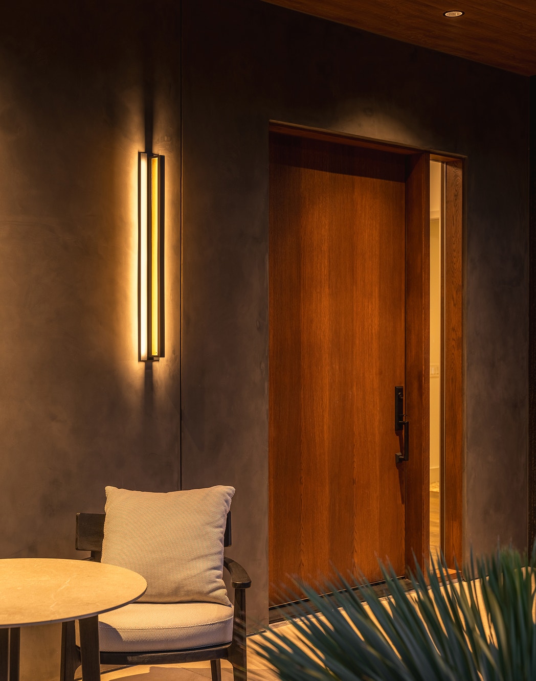 A modern welcome. The Anton Large Wall Light by Sean Lavin creates a warm glow next to a seating area on the front patio. Design by Caitlin Creer.