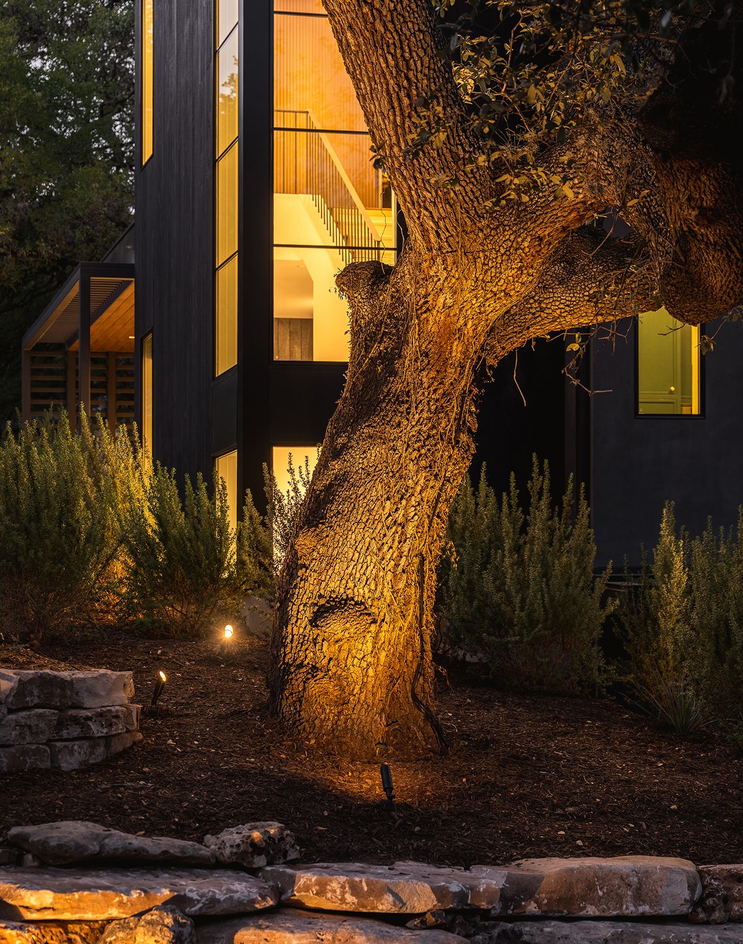 Directional spotlights by Sean Lavin illuminate one of the iconic live oak trees giving the house its nickname, The Treetop Social Club. Design by Strata Landscape Architecture.