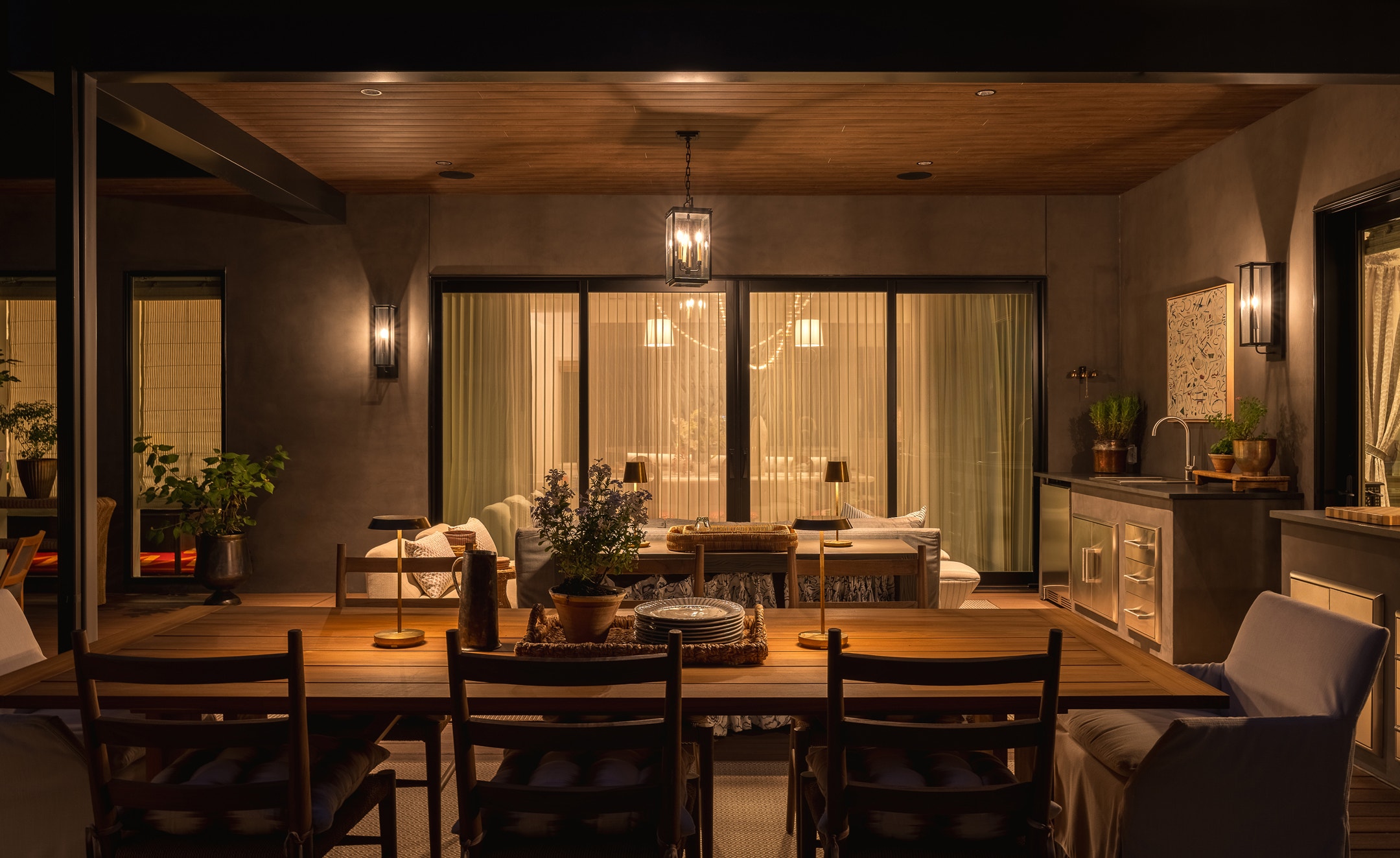 The home’s spacious, functional back deck features the Cheshire Medium Hanging Lantern by Chapman & Meyers overhead. The Dresden Medium Wall Lantern by Thom Filicia and Tepa and Nevis rechargeable lamps by Sean Lavin offer beautiful illumination throughout. Design by Caitlin Creer.
