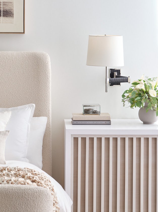 Let’s dive into each of the options above, and how to use them in your bedroom. Wall sconces are great for more than ambient lighting, they can also be installed in reading areas or beside mirrors to help brighten key spots in the space without overwhelming the atmosphere. Table lamps are obviously great for nightstands, framing the bed on either side, but they also work wonders on top of a dresser or vanity. And floor lamps are good for softening the room’s ambience, as an alternative to overhead lighting.