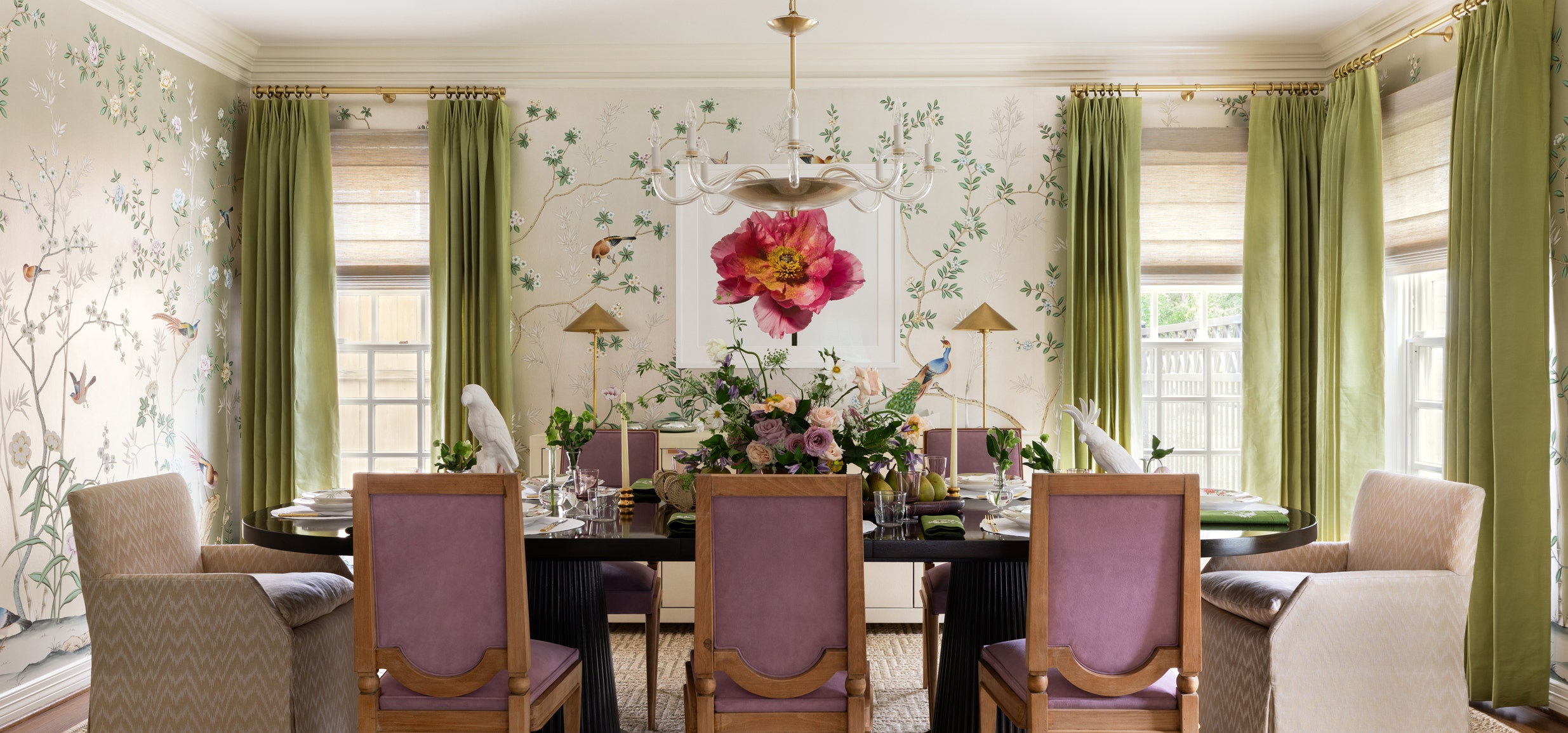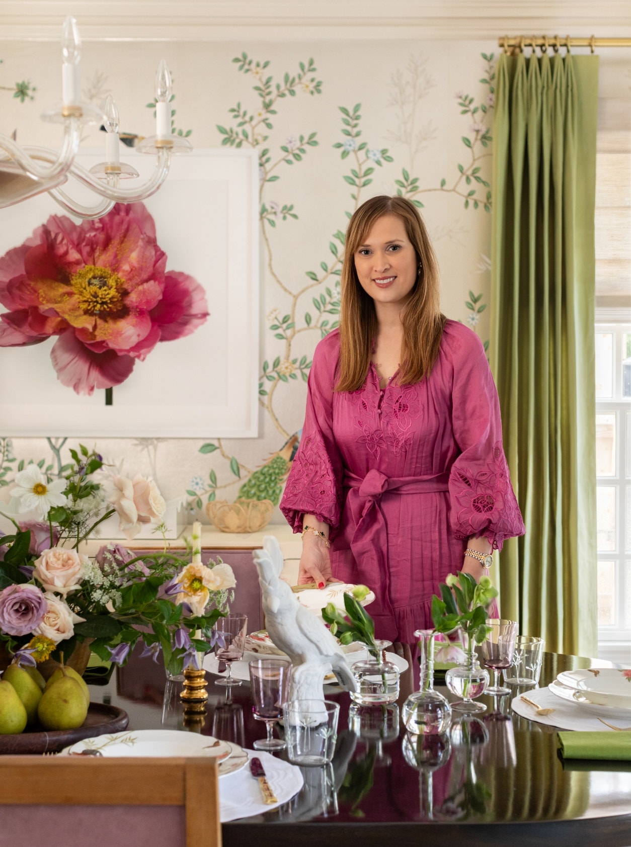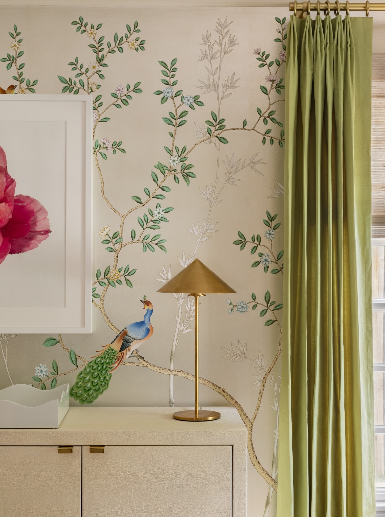 From the showstopping deGournay wallpaper to the custom double pedestal table, lilac suede Andre Arbus chairs and Brigitte Large Chandelier from her namesake collection with Visual Comfort & Co. Contreras’s dining room is a layer cake of refined beauty. Still, every inch of it was designed to be shared. “While some may argue that formal dining rooms are pointless because you only use them a few times a year, I love having rooms in the house that set the stage for special occasions, holidays and special memories,” the designer says. “A beautiful dining room is festive, inviting and memorable. If anything, having this lovely formal dining room in our house has inspired me to host friends and family more often.” No matter the occasion, the mood in the dining room remains unfussy, thanks to spring green drapery, a shock of pink coming from the large-scale Paul Lange photograph, a clean-lined sideboard and the graphic punch of Contreras’s Orsay Medium Table Lamp.