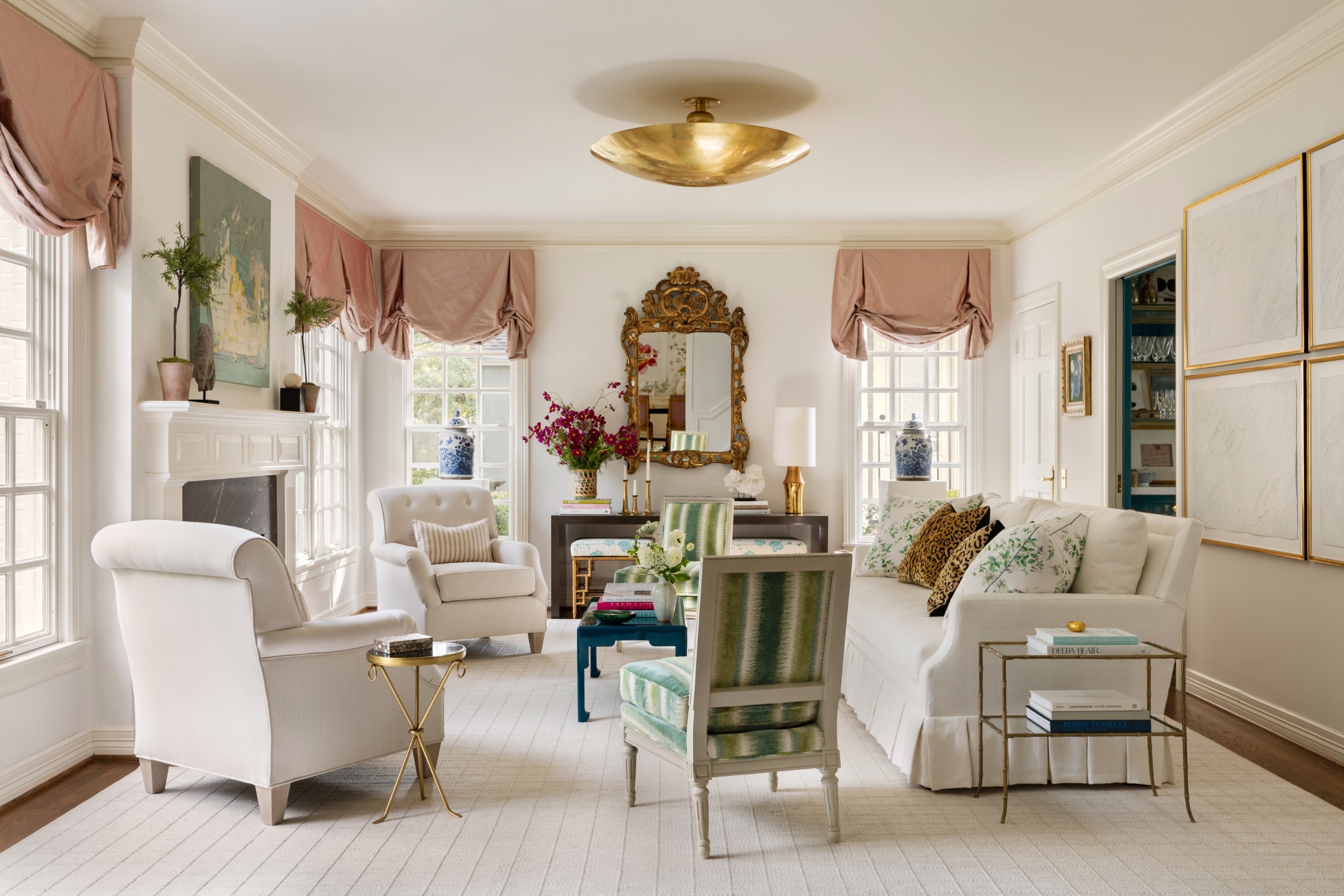 Arguably the most traditional room in the house, the formal living room crowned by the Comtesse XL Uplight Chandelier draws upon great sitting rooms throughout history for inspiration … and if you look closely, you’ll find a few tried-and-true pages from Contreras’s design playbook. For starters, upholstery is neutral with sweet details (like a box-pleated skirted sofa), and little upgrades here and there (honed Nero Marquina marble on the existing fireplace surround, pink balloon shades to make the most of shallow windows, shiny brown lacquer on an inherited console) allowed the designer to work with what she had.