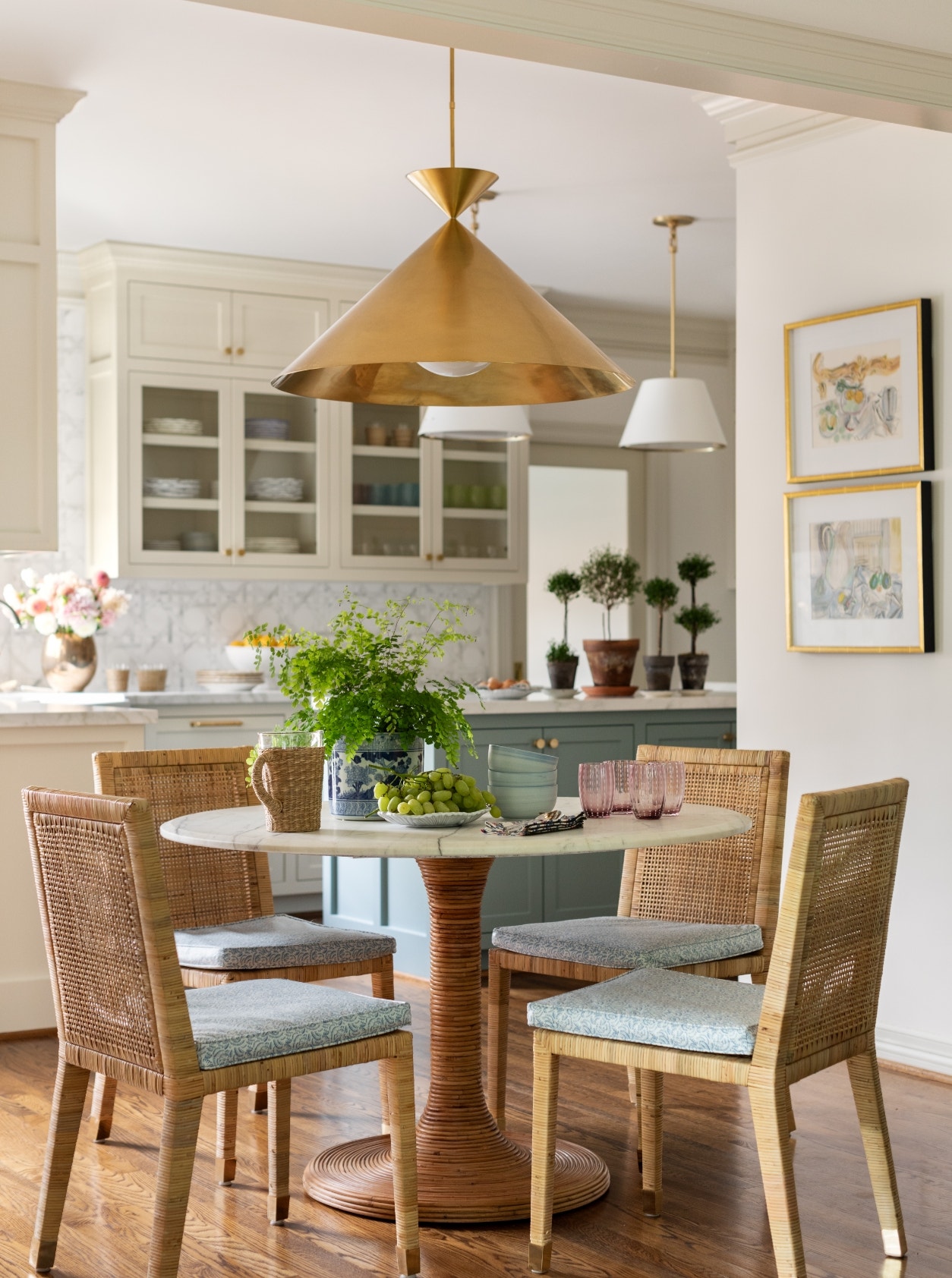 Housed in an existing extension at the rear of the home, the kitchen and breakfast nook leads to the family room where Contreras, her husband and their young daughter begin and end most days. Though these spaces are purpose-built to stand the test of time, a thoughtful design plan keeps things balanced. Airy details like rattan seating and a calm palette are grounded by brass accents, namely the Orsay Grande Pendant over the breakfast table and 18" Cabinet Maker's Picture Light over the hardworking built-ins.