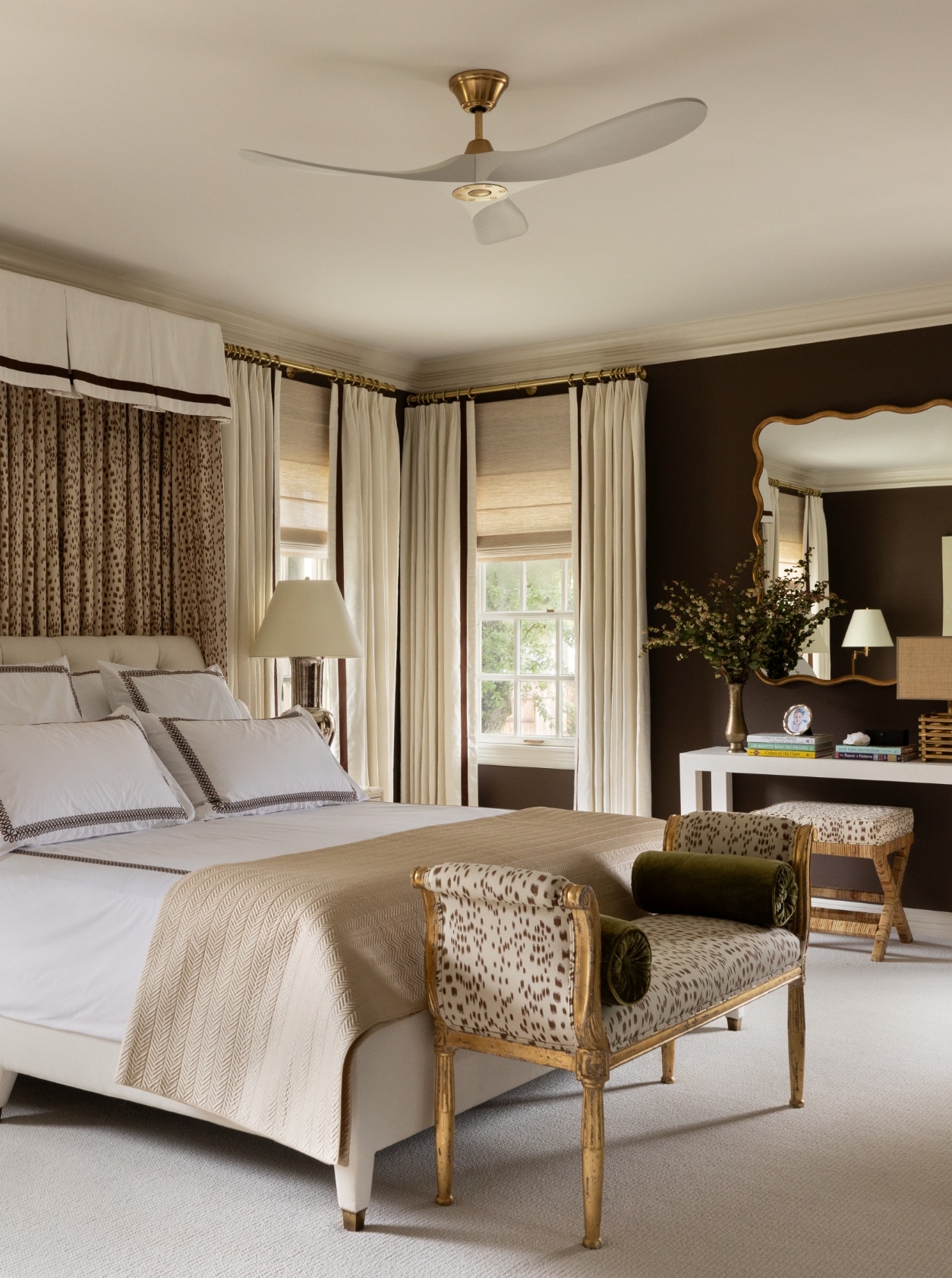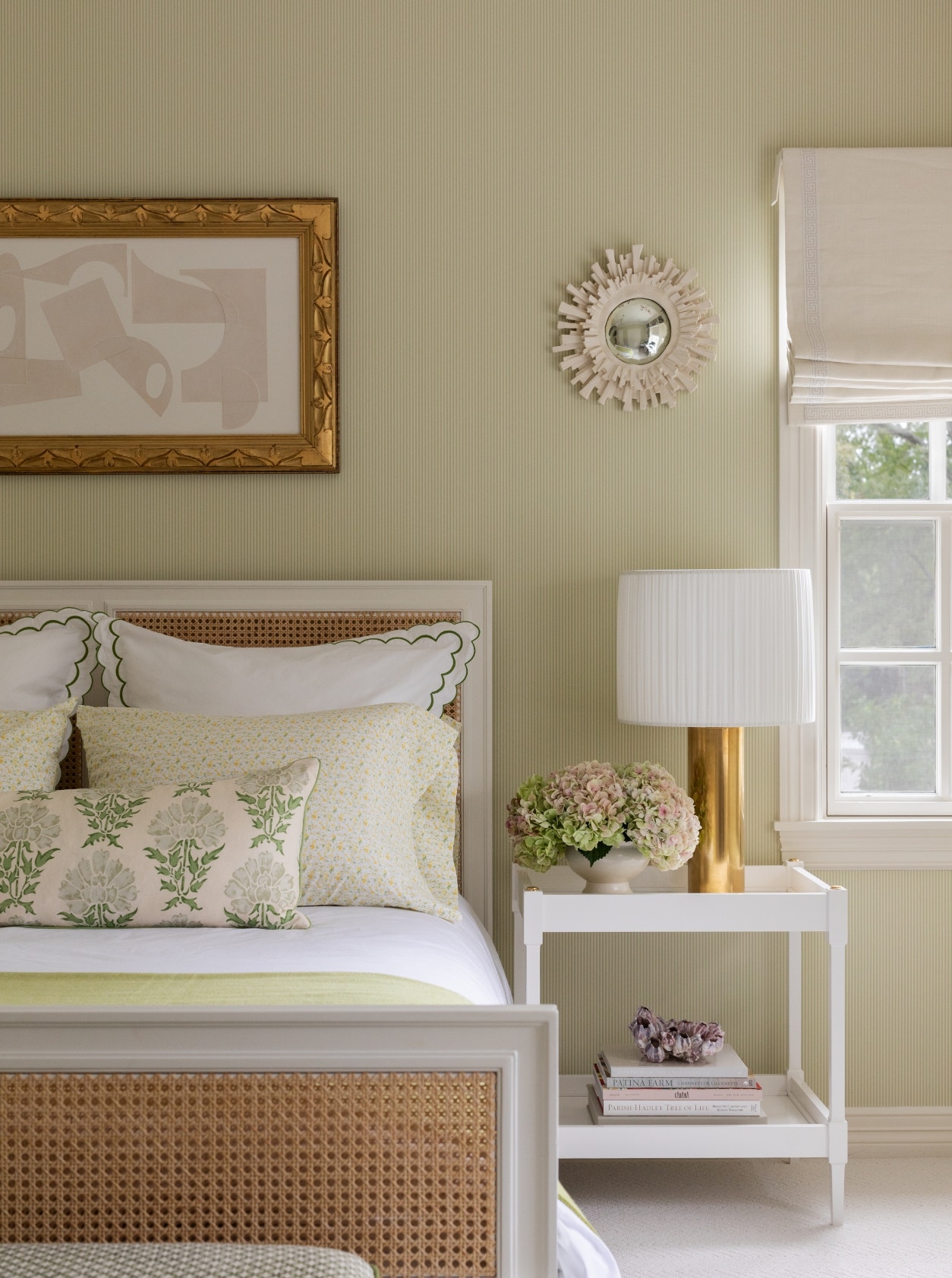 A well-placed dose of classic pattern in a camel colorway shakes up the sleek primary bedroom, where the walls are a moody (and unexpected!) shade of brown. The effect is striking but never heavy, thanks in part to the Maverick 60" Ceiling Fan overhead. In a citron-tinted guest room, collected art, textiles and decorative objects in a calm palette of fresh, pale greens form the perfect backdrop for the zing of a Sylvie Medium Table Lamp. “The palettes could not be more different,” Contreras says of these two bedrooms, “but the result is very much the same: comfortable spaces that feel like a soothing respite from the outside world.”