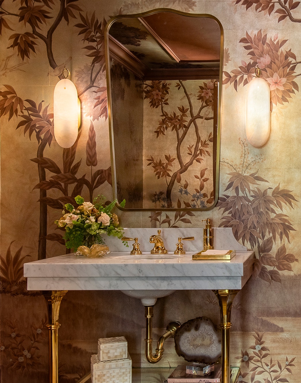 Organic shapes abound in the powder room, where a botanical wallpaper interplays with soft curves of a gilded mirror flanked by two Cora Small Sconces by Chapman & Myers. Ladies Powder Room by Jennifer Bevan Interiors