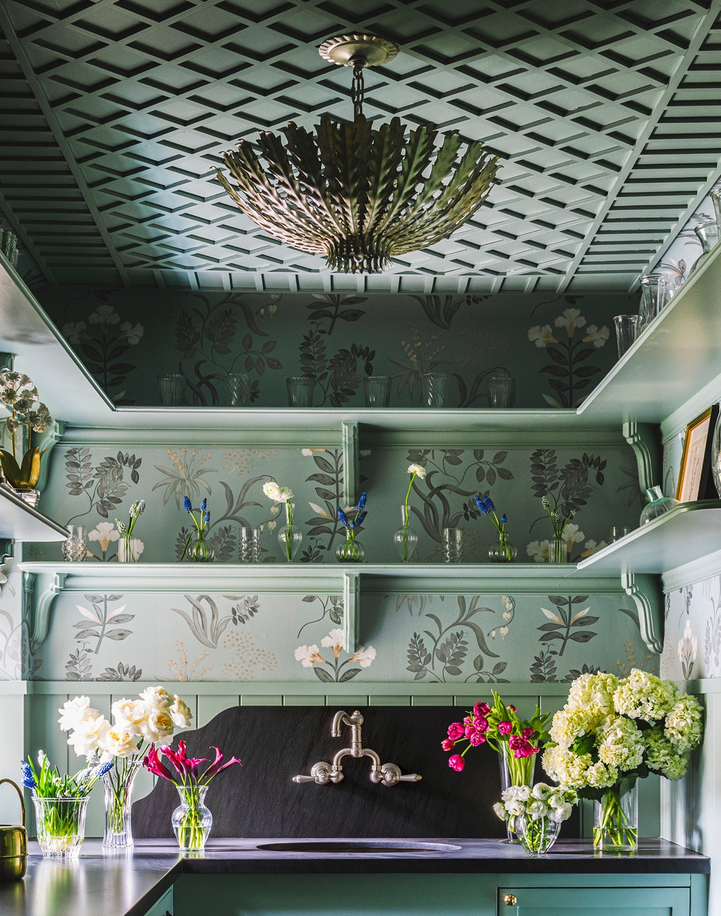The Hampton Medium Chandelier in Burnished Silver Leaf by AERIN draws the eye upward in the flower room, showcasing a tray ceiling with a latticework motif. Flower Room by Gex Designs