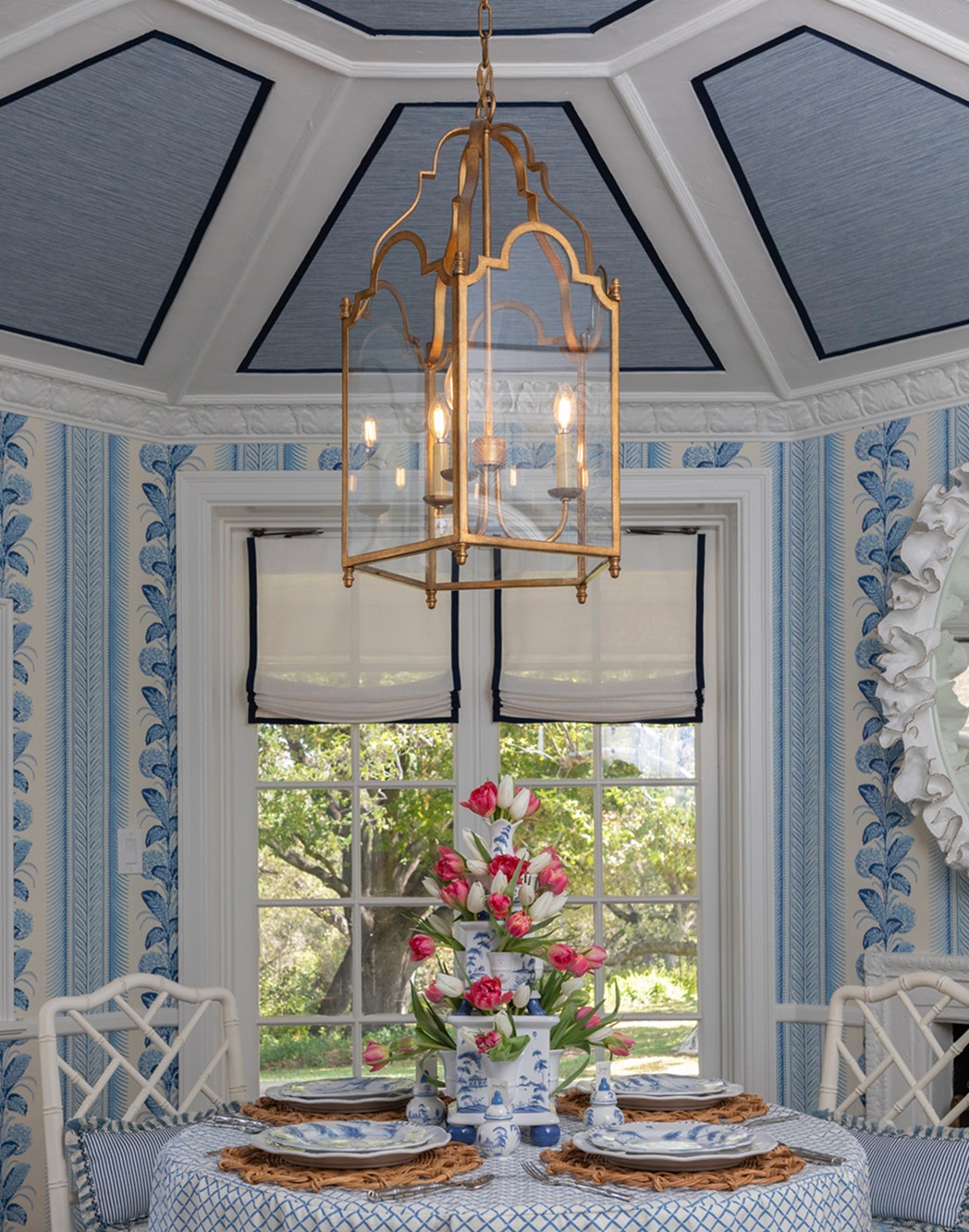 In the home's morning room, cheerful wallpaper is the perfect backdrop for the French Market Medium Lantern by Chapman & Myers. Morning Room by Samantha Williams