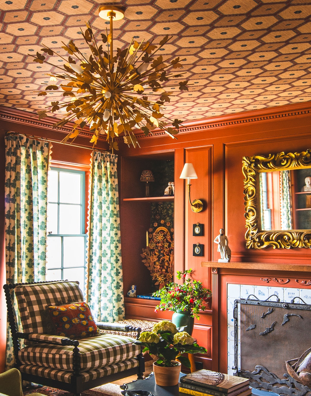 Rich patterns, warm tones and an original fireplace offer English-inspired charm, all illuminated by the Farfalle Medium Chandelier by Julie Neill above and Piaf Single Sconce by Thomas O'Brien at the fireplace. The Library by Julia Chasman Design