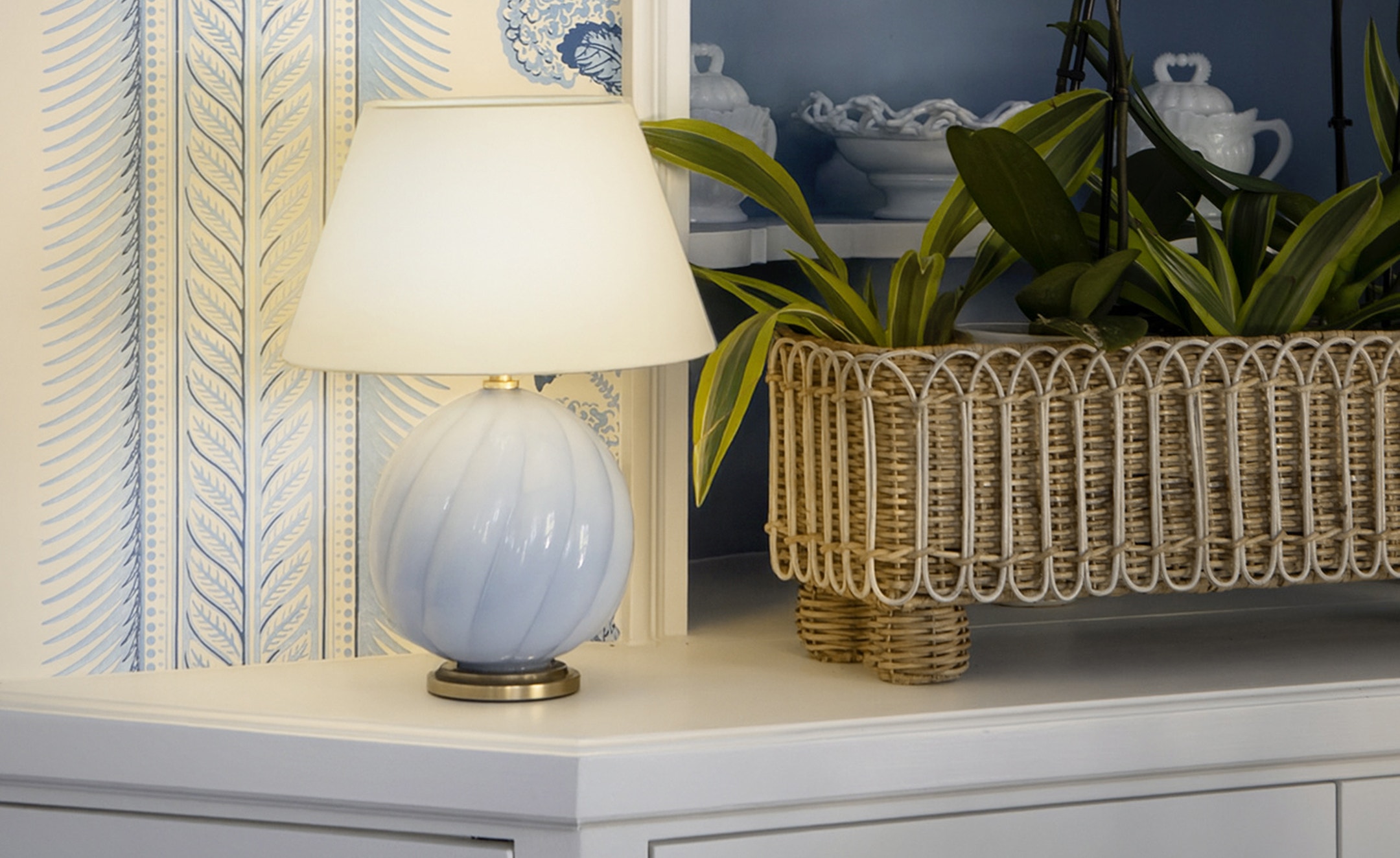The Talia 13” Cordless Accent Lamp by Julie Neill helps to create a sense of innate coziness in the blue-and-white space. Morning Room by Samantha Williams
