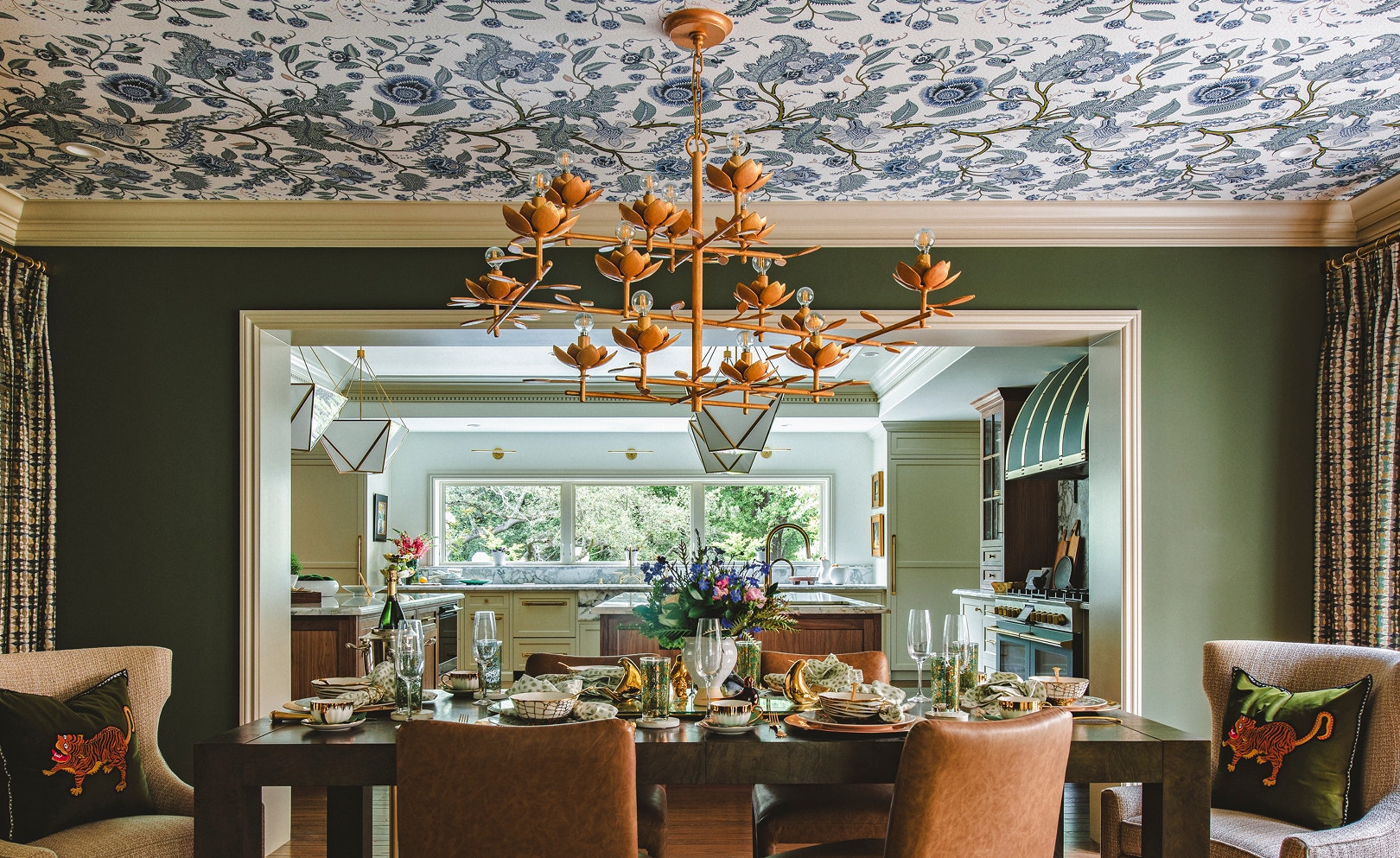 The home’s traditional aesthetic receives a breath of fresh air in the form of blue-and-white wallpaper and the airy, gilded details of the Clementine 48" Low Wide Tiered Chandelier by Julie Neill. Kitchen Great Room by Rachel Duarte Design Studio
