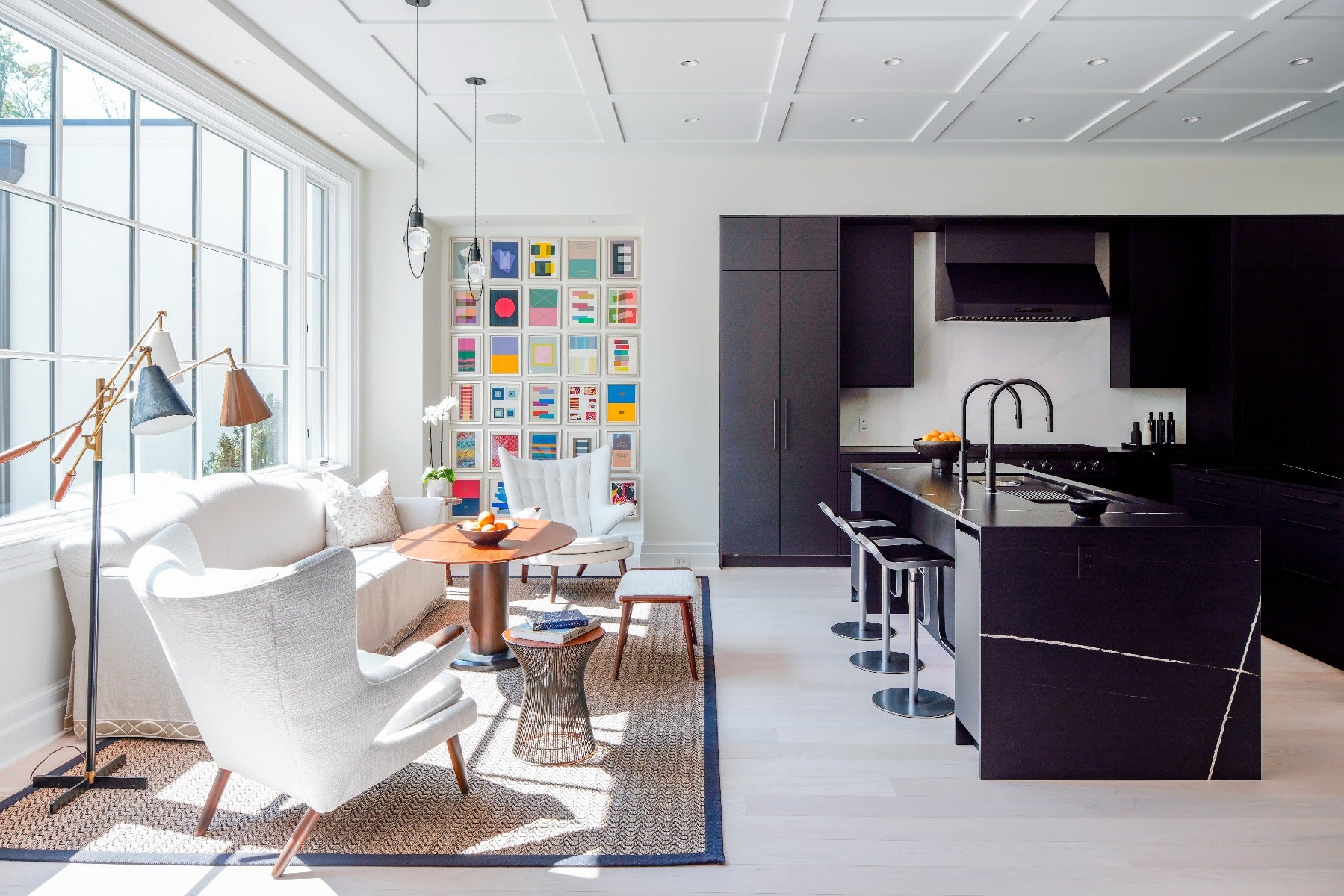 Designer Pamela Harvey of Pamela Harvey interiors designed this breezy great room – which features a Swing Articulating Floor Lamp by Barbara Barry – –aiming to highlight architectural details.“Among my favorite elements of the Family Room are the mix of art, the room’s architectural detailing, and the simple, balanced furnishings. Two abstract paintings by artist William McClure were commissioned for the space and flank the fireplace,” Pamela said.