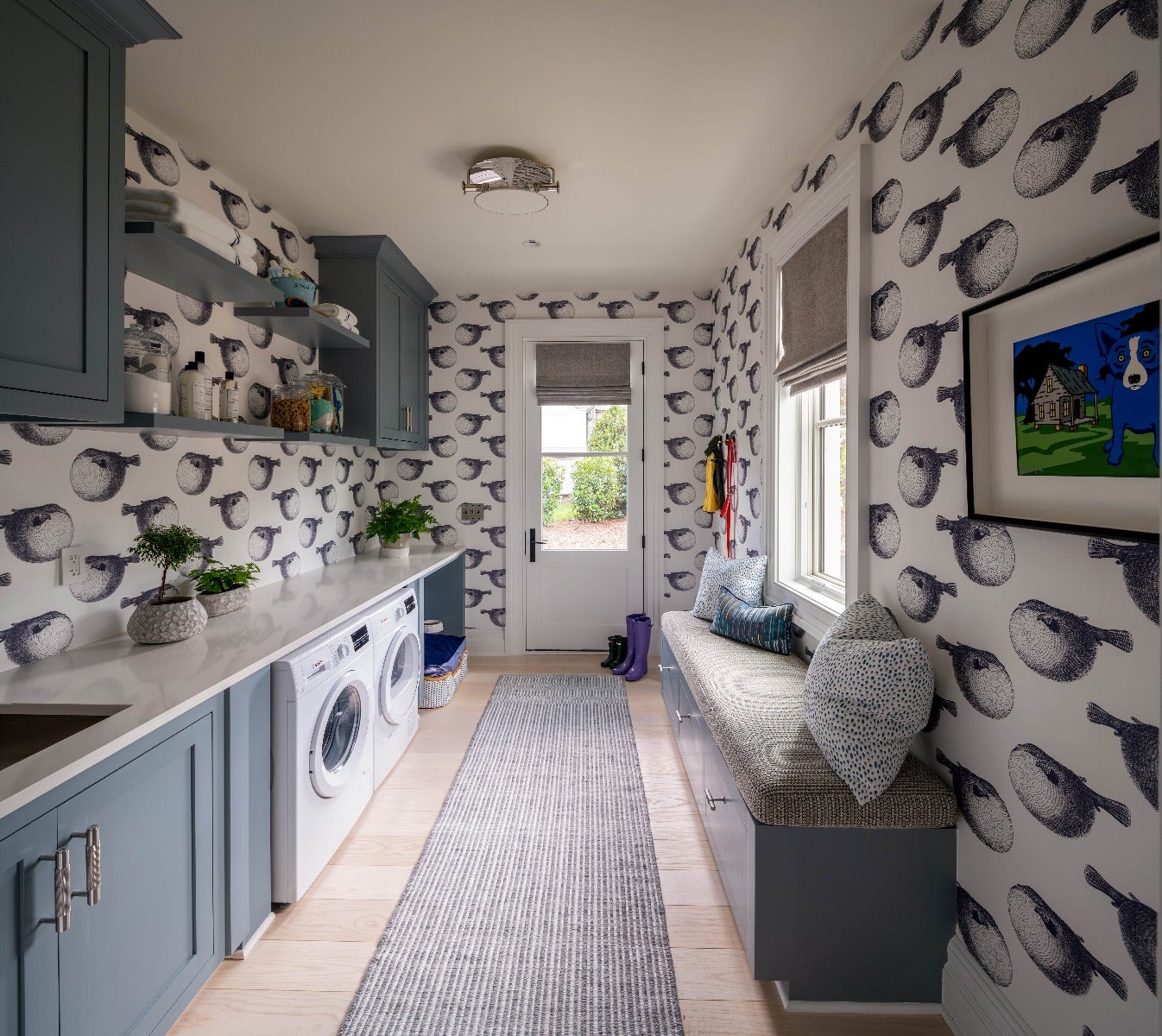 Making a splash for her firm’s first showhouse, Elizabeth Gill chose a graphic wallpaper and the Osiris Medium Flush Mount by Thomas O’Brien for this luxury laundry room. “The laundry room, which also serves as a mudroom, is designed with family in mind. The space is both practical and playful with a hand-printed blowfish paper in a dark grey colorway that ties into the greys used in the entry,” Elizabeth said. “The custom cabinetry is painted in Cadet Blue by Sherwin-Williams and the hardware is designed by LA’s Buster + Punch.”