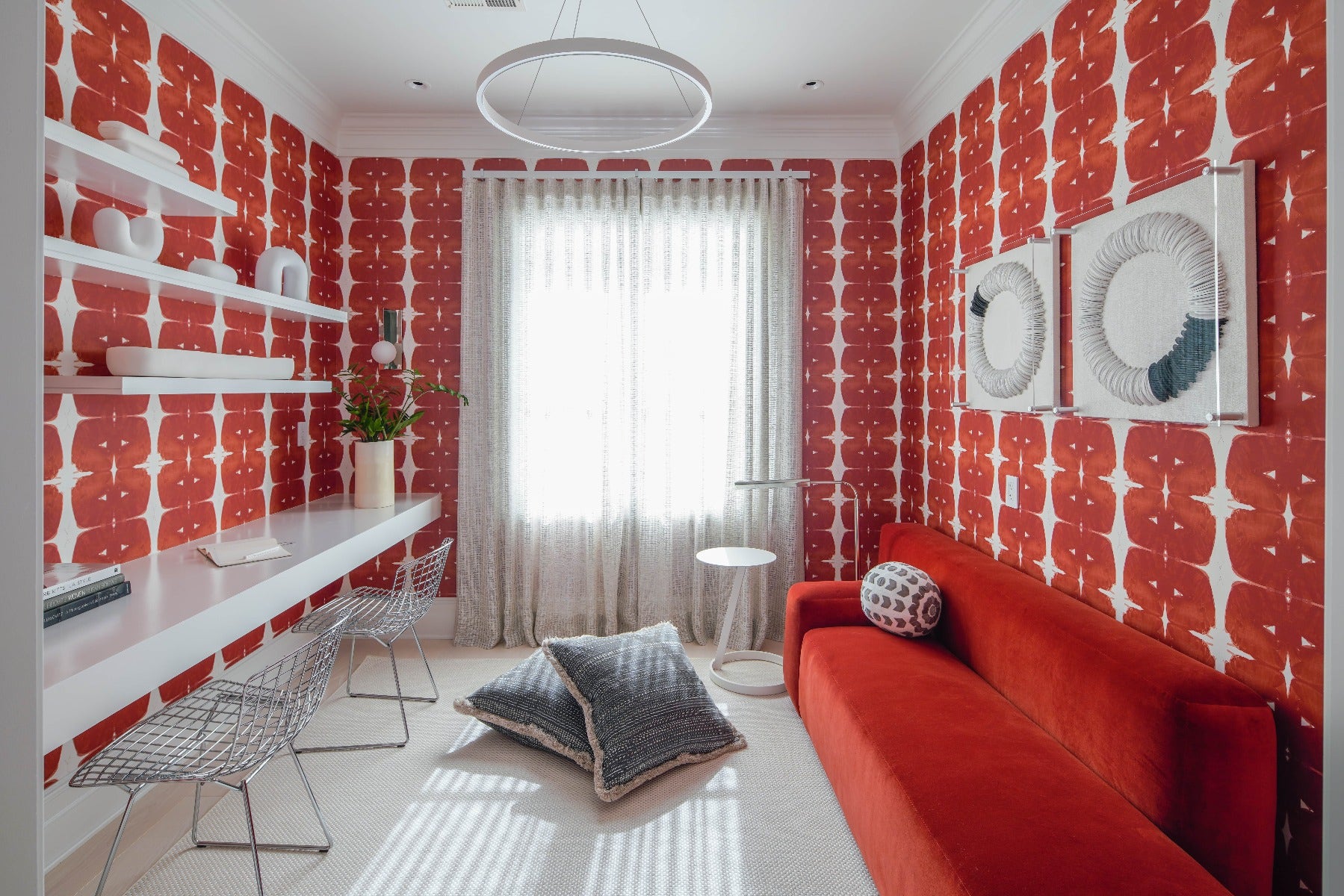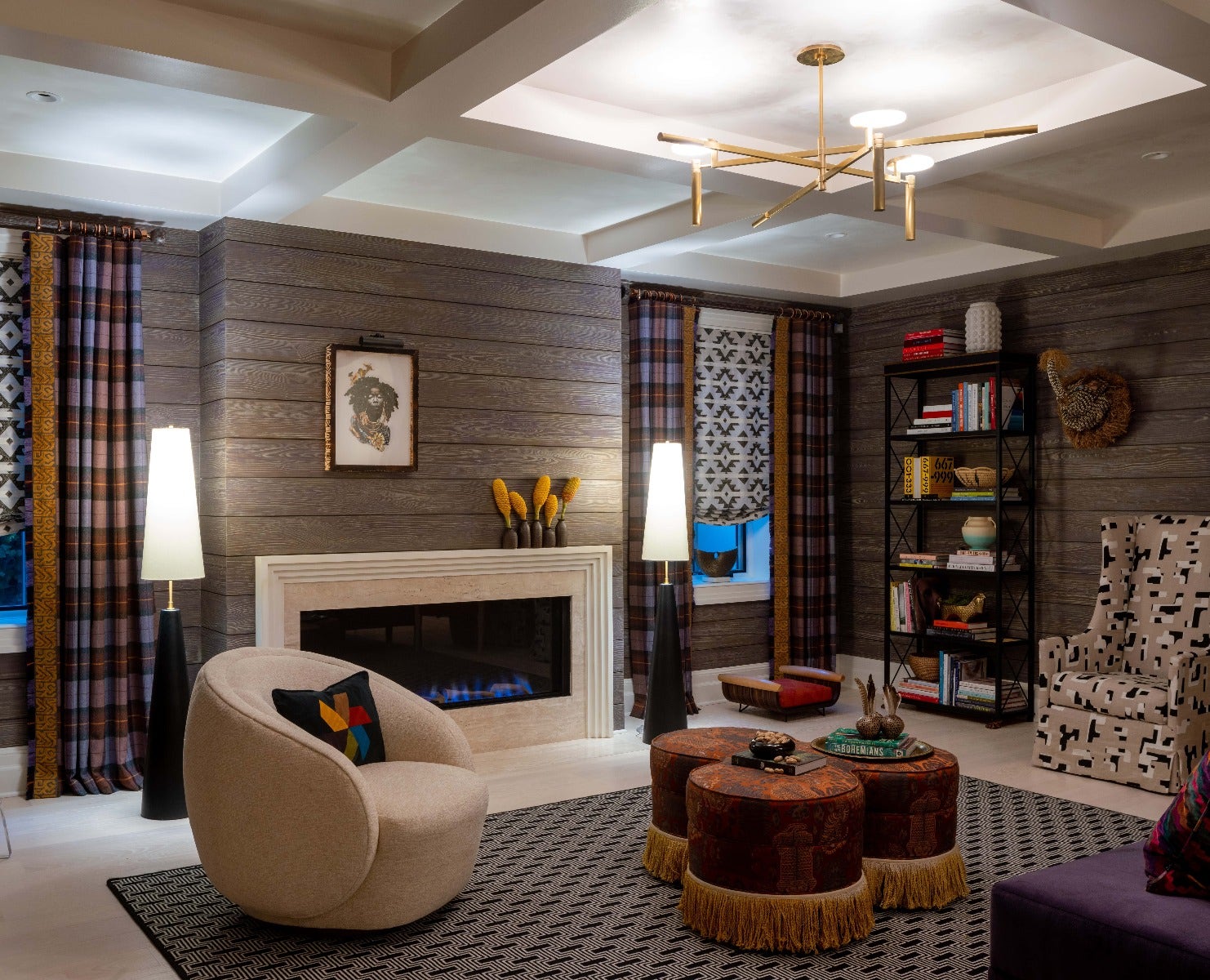 The Melange Large Floating Disc Chandelier by Kelly Wearstler and the Lorne Floor Lamp by Kelly Wearstler contributes to the mid-century modern feel of this relaxed recreation room by Kiyonda Powell of Kiyonda Powell Design Studio. “With a focus on entertaining, I let the space guide my design direction. There are architectural details and finishes that are prominent in the home so I chose to embrace and enhance the room’s envelope,” said Kiyonda. “The walls are wrapped in shiplap, which inspired me to come up with a design that celebrates entertaining in a remote cabin setting. I wanted to create warmth with wood textures and layer the space with familiar, yet reimagined patterns and motifs. I have coined my design concept Cabin Cool – the place where people can gather and enjoy each other’s company with games and lively conversation. The cool place to be!”