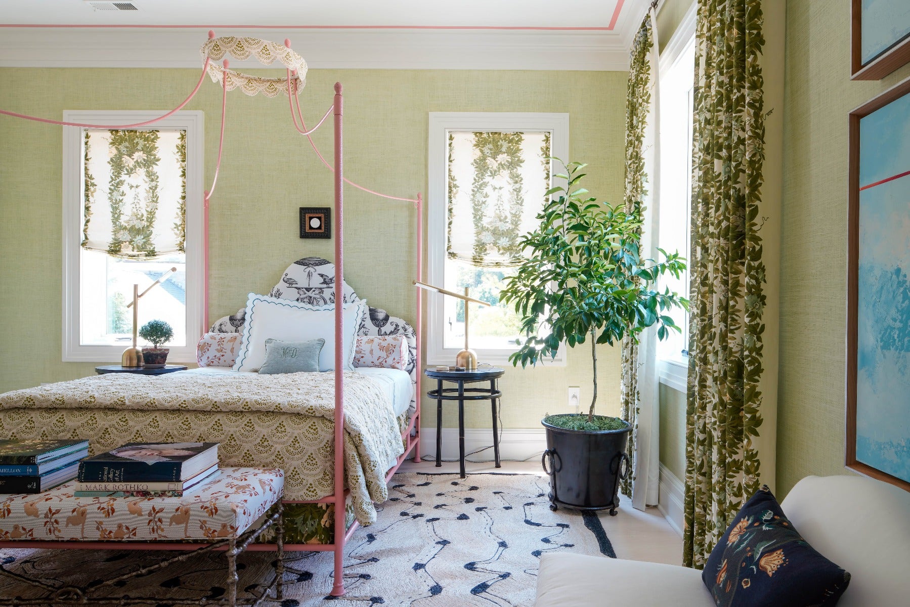 An obvious fan of color and pattern, Melissa Colgan designed this bedroom with just the right amount of quirk. The modern lines of our Rousseau Boom Arm Table Lamp by Kelly Wearstler create an interesting juxtaposition among chintz and pastels. “I’m creating a bedroom inspired by a modern-day Bunny Mellon, who may have a bit of the counter-culture motivations of Billie Eilish running through her veins. Maybe the room is for the coolest Granny in the state or maybe it is for a teenager with a very old soul, but either way, I was inspired to take some of the more classical Southern design tropes and play with them in an effort to make “old” ideas feel young and fresh,” said Mellissa.