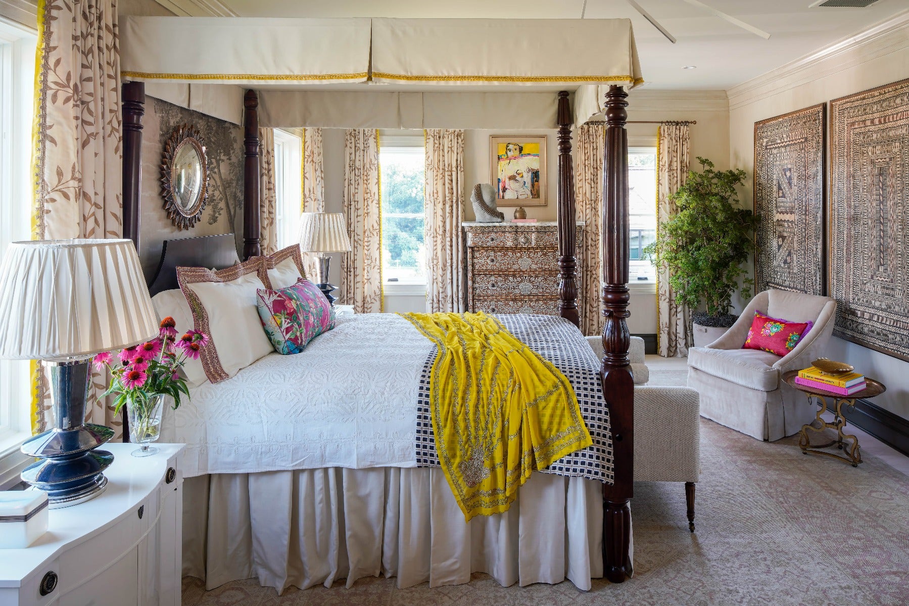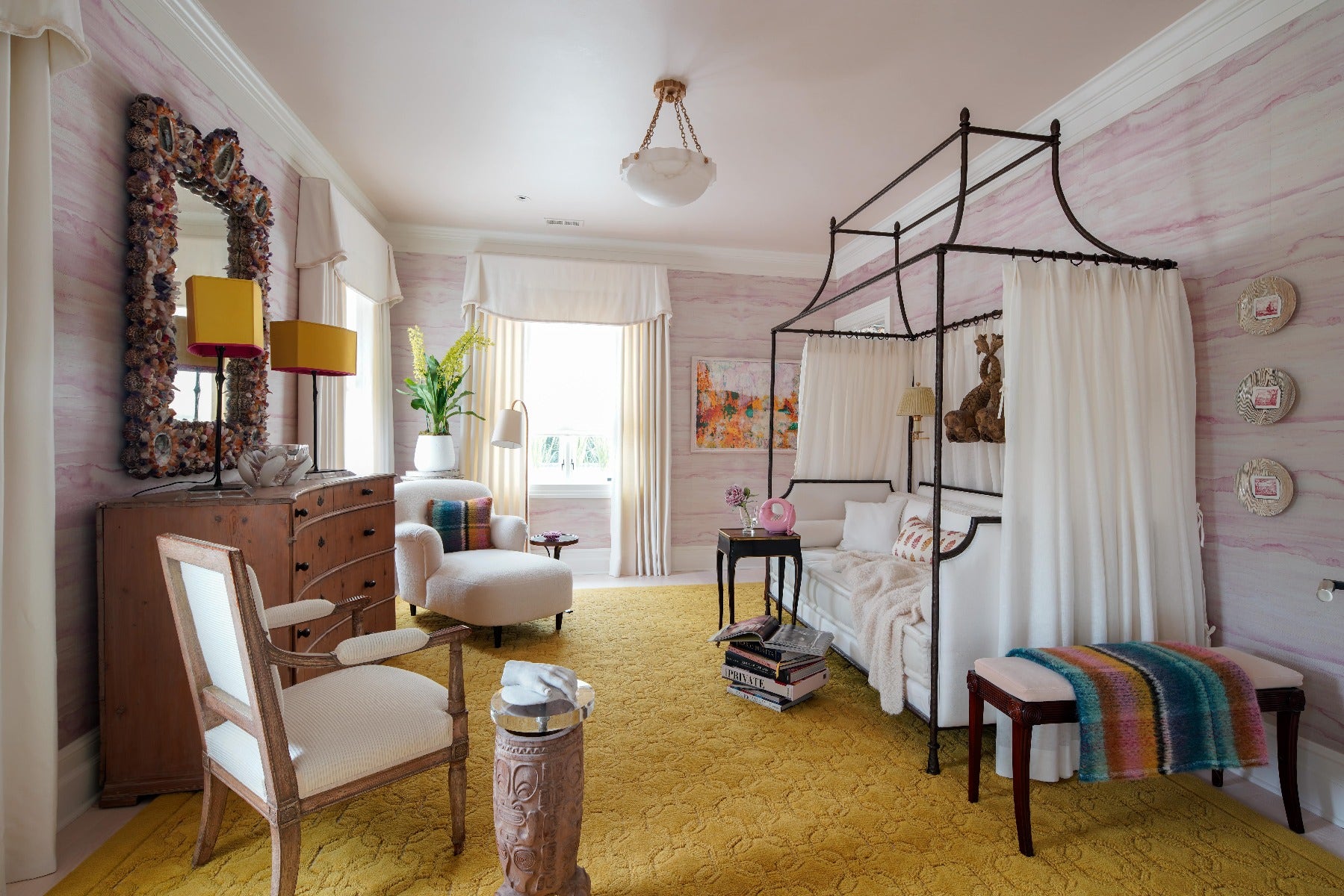 Mary Douglas Drysdale, the showhouse design chair and designer of the master bedroom, employed layered whites, modern artwork and our Strada Large Flush Mount by Kelly Wearstler to create fresh and fun retreat.