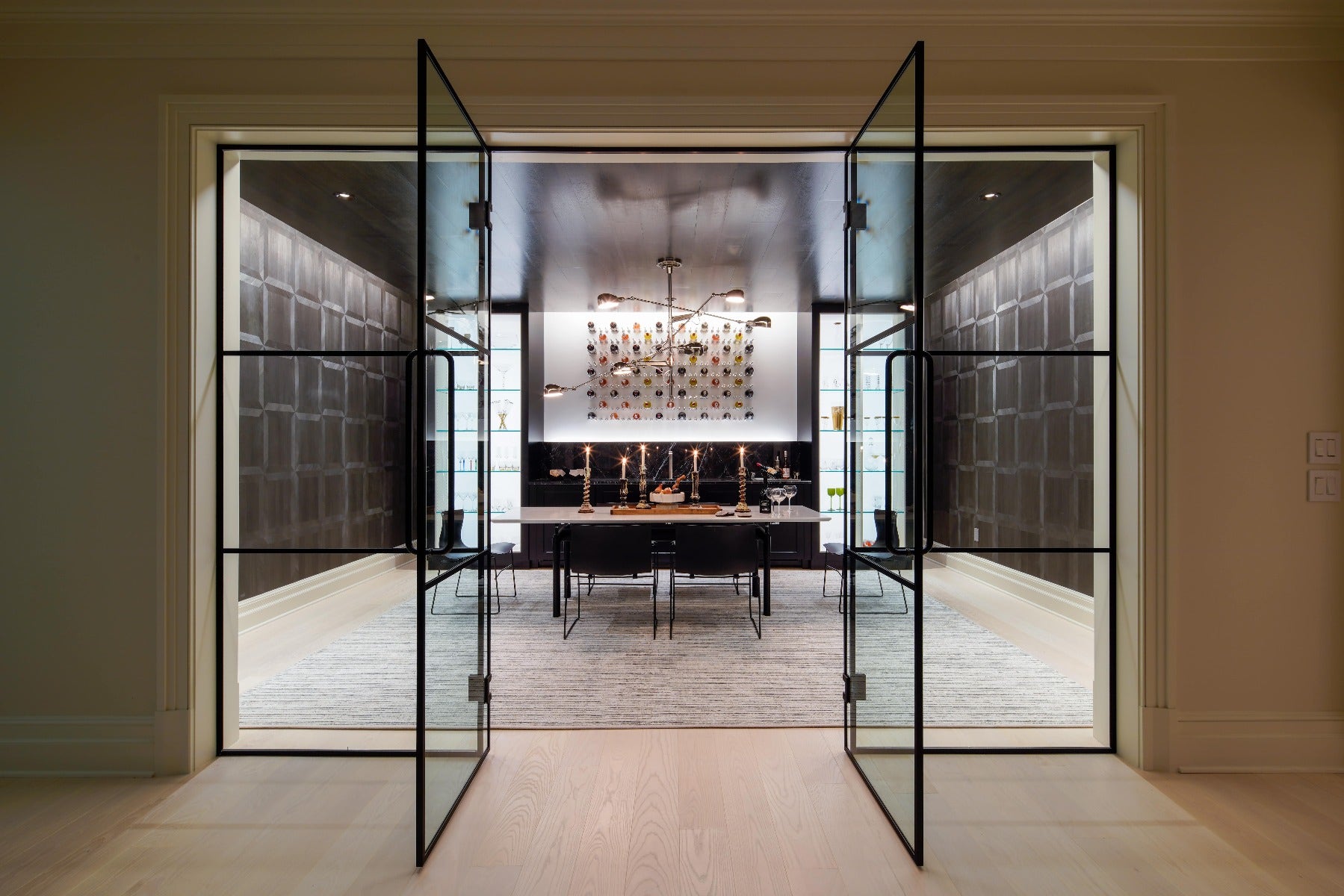 Olvia Demetriou of Haptstack Demetriou Design designed this grand wine bar using our RL ‘67 Extra Large Triple Arm Chandelier by Ralph Lauren for a space that is simplistic but not without drama. “The Wine Bar was conceived not as a storeroom for wine, but rather as a destination place to celebrate wine as a shared social activity. Our concept was to make the Wine Bar feel like a glamorous escape – perhaps enough to get dressed up for within the comfort of one’s home,” said Olivai. “Designed to standout as unique, we chose to make the room seductively dark and atmospheric with a dramatically-lit feature wall.”