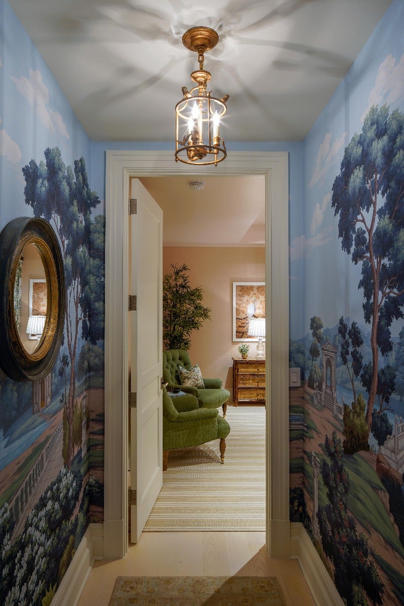 Art historian and interior designer, Annie Elliott, frequently leans on the principals of museum work in her interior design projects and likes to create spaces that are in her words “a life collected rather than a room decorated.” Here, in the guest vestibule, Annie illuminates the whimsy of detailed wallpaper with our Diego Petite Classical Perching Bird Lantern by Chapman & Myers.