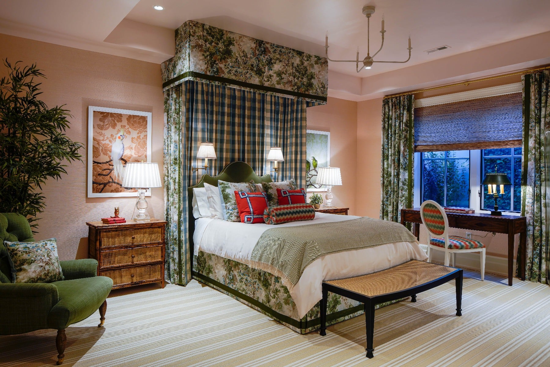 The push and pull of masculine and feminine give way to a guest bedroom that is full of sublime surprises. A floral and plaid valance trimmed with a pair of our Dorchester Swing Arm Lamp by Chapman & Myers anchors a layered bed under the Piaf Large Chandelier by Thomas O’Brien. Delicate Balustrade Table Lamps by Chapman & Myers are positioned on either side to soften the space. “The room is a mix of vintage (and vintage-look) furnishings, such as the bamboo bedside tables, French cherry desk, low tufted lounge chairs and contemporary pieces, such as the large-scale photographs by Claire Rosen, and the upholstered desk chair,” said Annie. “In the end, the seemingly disparate elements form a cohesive and delightfully unexpected space.”