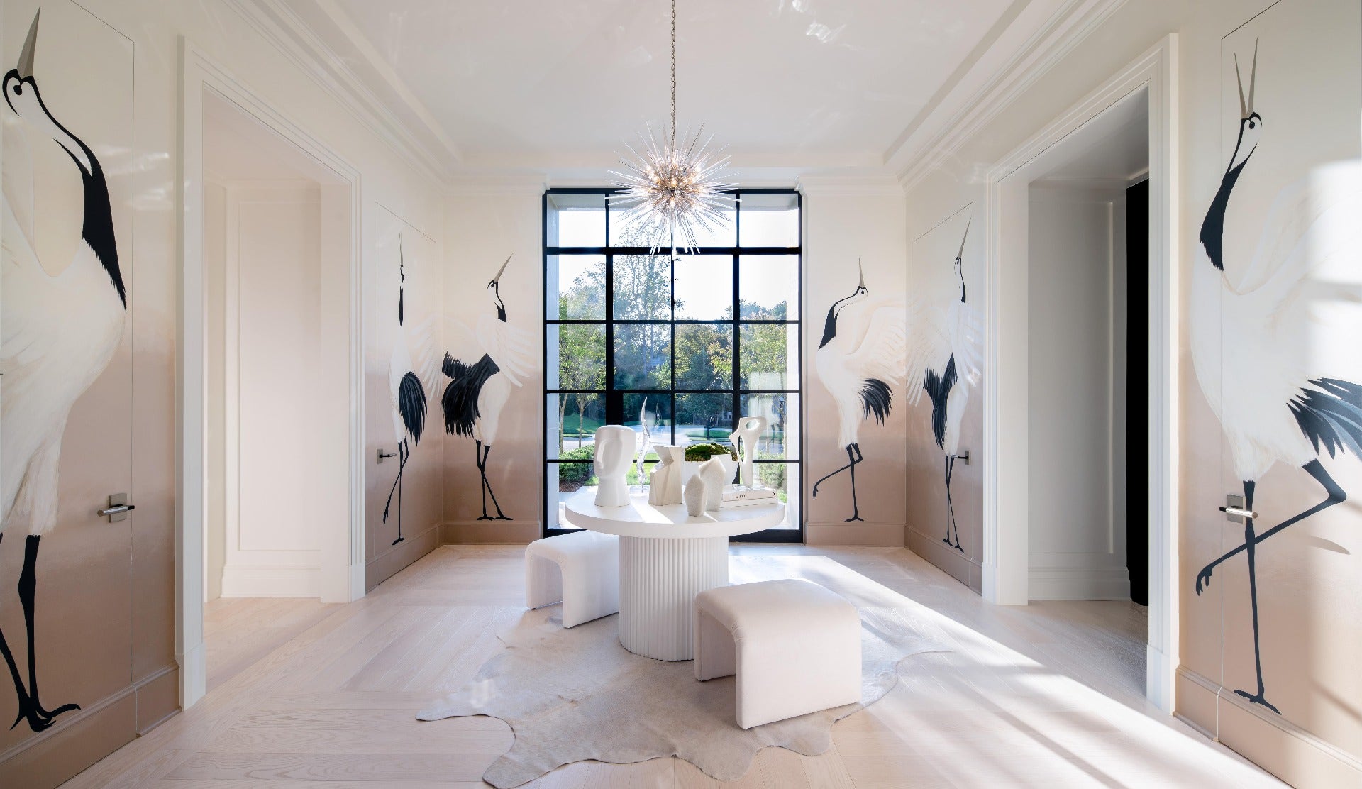 Budapest native Katalin Farnady of Farnady Interiors was tapped to design the grand entryway of the home. Dual doorways frame our Quincy Medium Sputnik Chandelier by Chapman & Myers in this chic space featuring a floor-to-ceiling paned iron door and largescale wallcovering.“My space is the entry foyer, which generally creates the feel for any home you walk into. It introduces the home’s personality and welcomes your guests,” said Katalin. “This entry is an introduction to the many rooms created by the showhouse’s group of talented designers.
