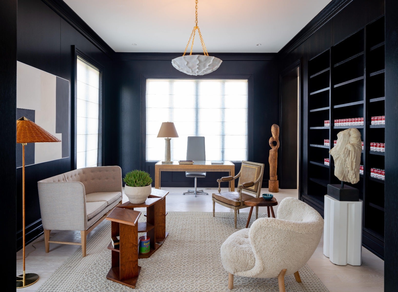 Merging some of his favorite styles including Scandinavian design, French Art Deco, and Neoclassicism, designer Nestor Santa-Cruz crafted this library to imply narrative and made our Benit Medium Sculpted Chandelier by AERIN the focal point of the room. “Great design must have a soul,” said Nestor. “I love designing rooms and believe that memorable rooms have a clear design philosophy that transcends individual styles.