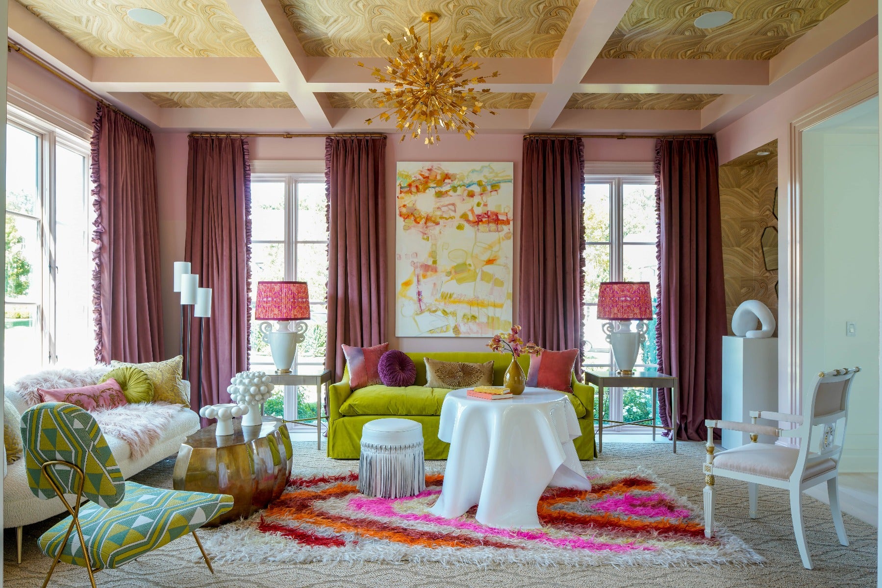 Janie Molster designed this vibrant living room flooded with light and exuberant color. Aptly, she chose our Farfalle Large Chandelier by Julie Neill to finish the space for its vivacious design bursting with butterflies. “Against the palest of coral-y pink walls, a contemporary landscape by Virginia artist Karen Blair hangs above a green velvet sofa flanked by pressed shell tables and jeweled lamps topped with whimsically patterned shades,” she said describing the space that features our Ralphaeli Large Handled Table Lamp by Christopher Spitzmiller (shown with custom shades). “Painted chairs inspired by Dorothy Draper surround a vintage 1970’s era acrylic draped table.” Our Aimee Floor Lamp by Suzanne Kasler is nestled in a corner lending itself to the retro and layered feel of the room.