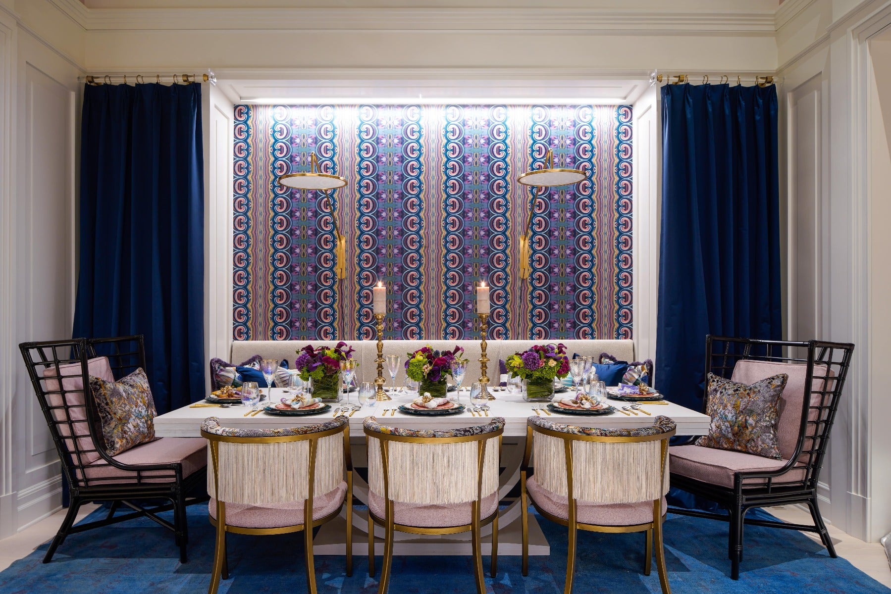 With a recent trip to Spain fueling inspiration, Jennifer Stoner of Jennifer Stoner Interiors conceived this eclectic dining room. The focal point – a graphic backdrop by artist and surface design Amanda Moody – features a pair of Dot 16” Articulating Wall Lights by Peter Bristol. “My design is inspired by a private supper club perhaps on the Catalan coast of Spain. Imagine a room of beautiful people sipping a Sazerac aperitif or a glass of Spanish vermouth on one side of the room and then shifting over to enjoy a wonderful intimate dinner in the vibrantly designed dining niche,” she said. “I recently enjoyed a wonderful design trip to Spain and was inspired by their love of color, texture and bold design.”