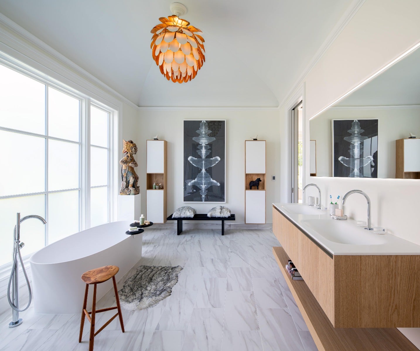 For the master bathroom, designer Jonas Carnemark used the Cynara Large Chandelier by Chapman & Myers. Sleek lines and warm wood tones intermix to create a spa-like environment.