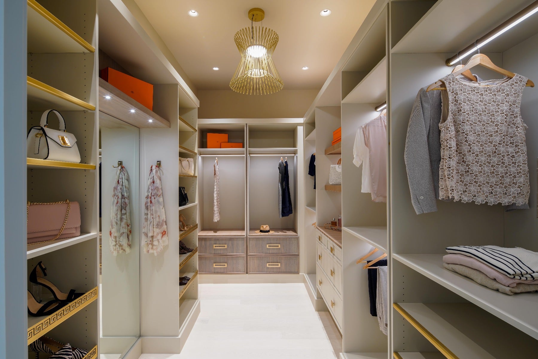 Felicitously, Paul Lobkovich of Lobkovich Kitchen Designs – who recently launched Lobkovich Wardrobes – was appointed to design these envy-inducing his and her walk-in closets. “Our goal in designing the Master Wardrobes was to create dressing spaces evoking the feel of high-end boutiques. This has been achieved by using fine, luxury finishes, integral LED lighting, and smart organizational accessories,” said Paul. “In Her Wardrobe, we paired taupe painted cabinetry with muted, bleached walnut accents for a soft feel,” he said of the space which features the Syrma Pendant by Tech Lighting.