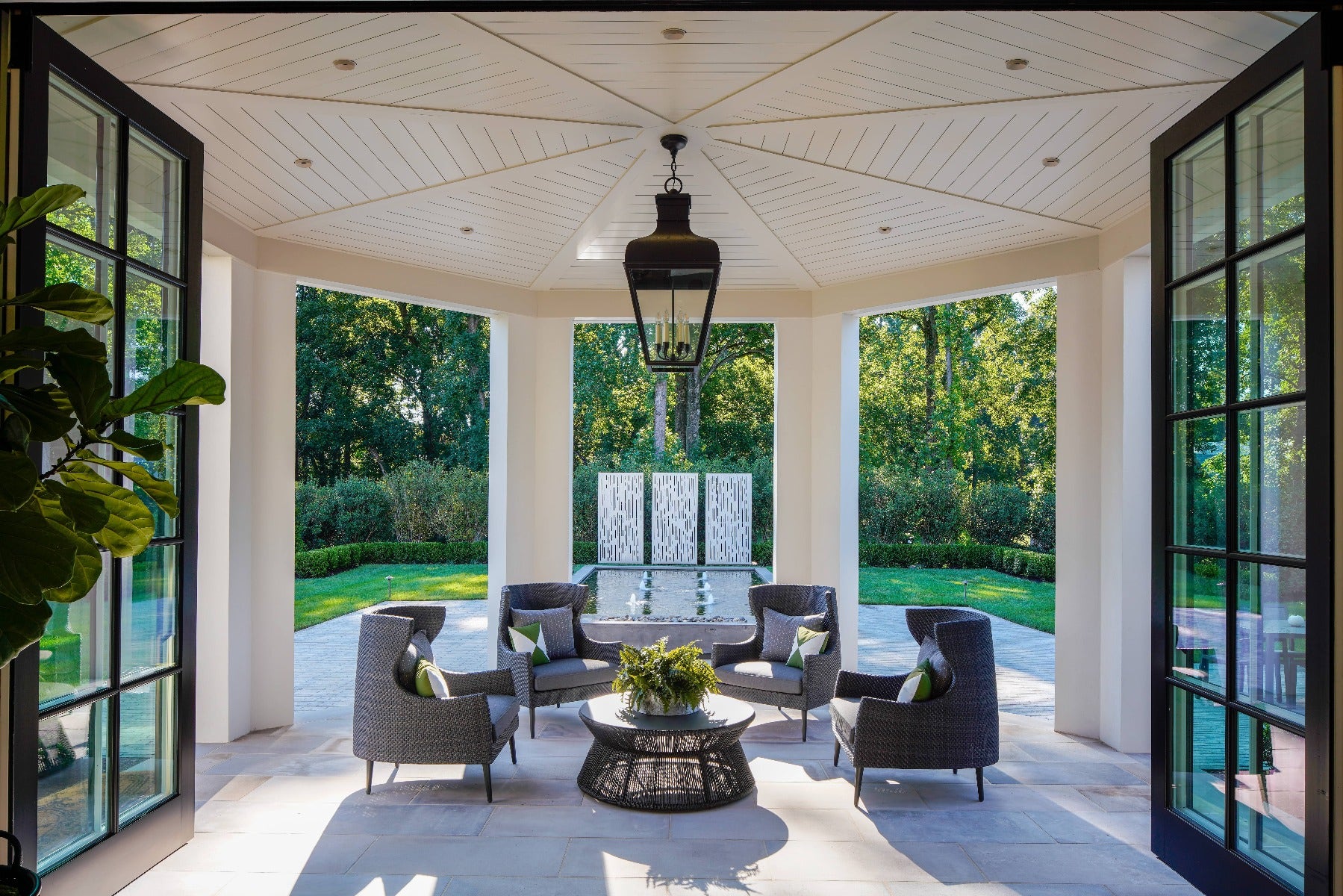 On the Veranda, architect and builder of the home, Harrison design, hung the Fremont Grande Hanging Lantern in French Rust with Clear Glass by Chapman & Myers over a mod lounging area.
