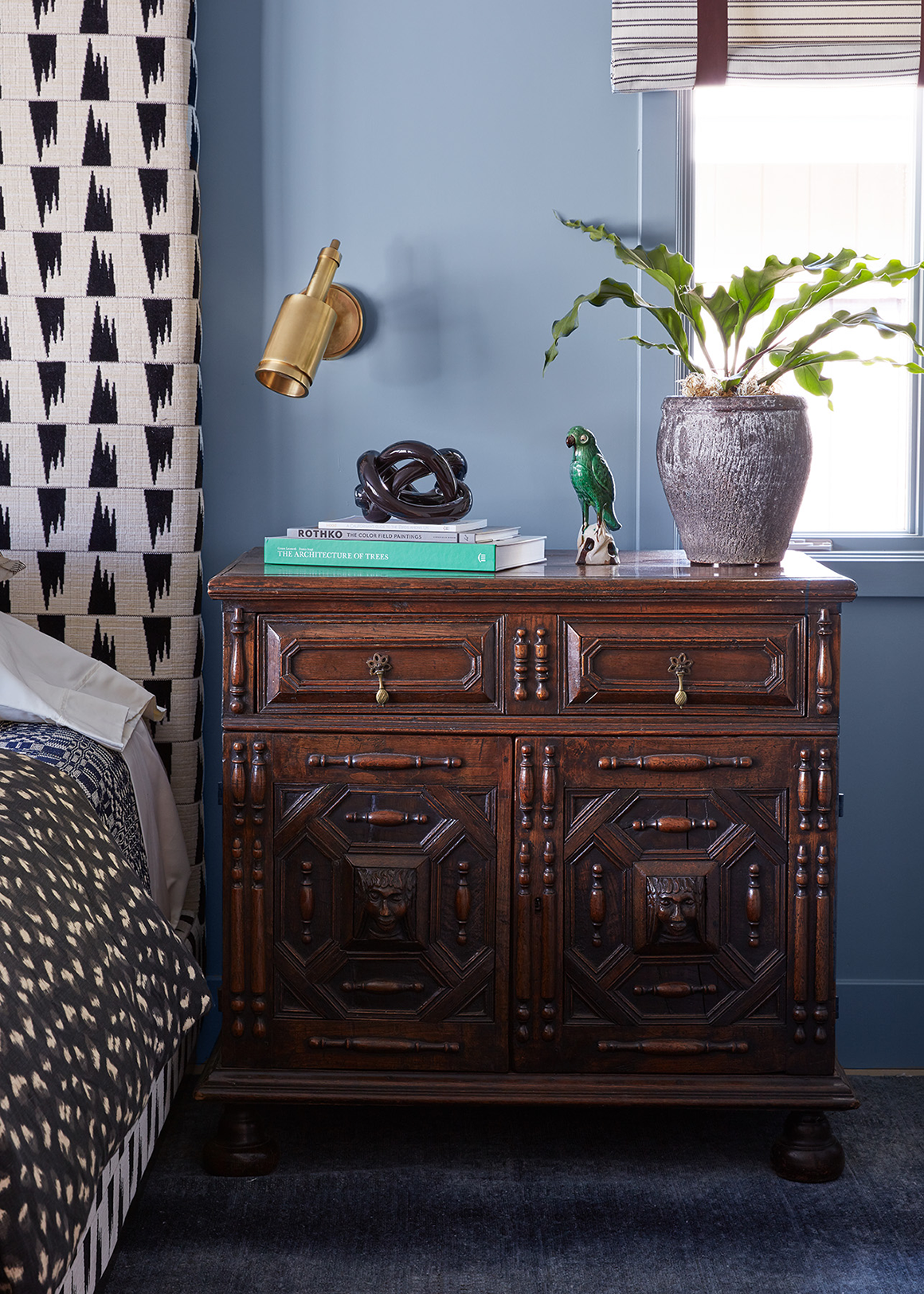 Macfee said, "The mix of old and new will never go out of style. New elements freshen old pieces and antiques bring character and soul to the new. This late 17th century oak cupboard has seen a lot in its time and I am honored to have it join my weird little world in this Master Bedroom space."