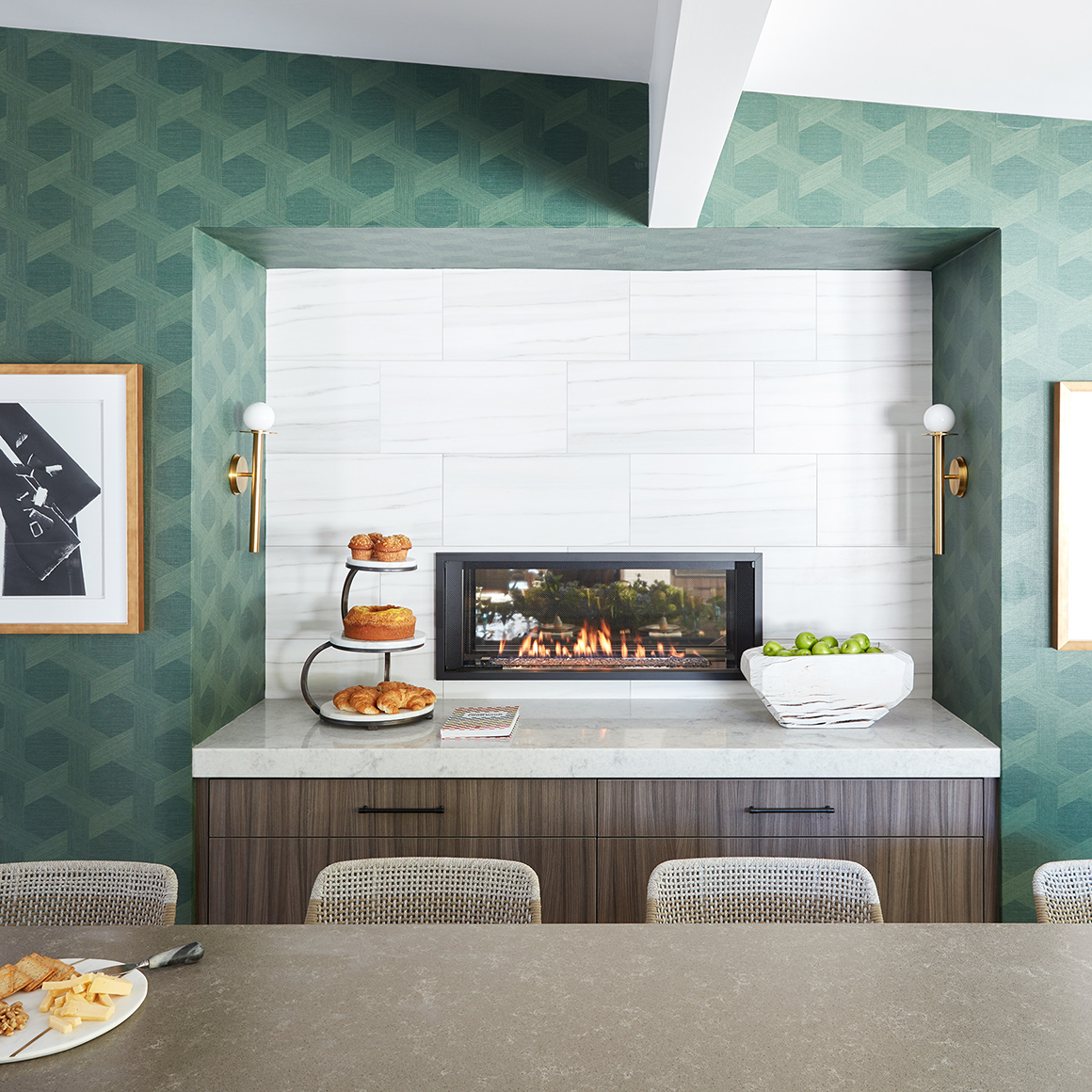 "The kitchen is anchored by a see-through fireplace with views to the dining room. We raised the fireplace "up" to create additional storage and a useful countertop for entertaining. Pastries in the morning or wine + cheese in the evening, this space is easily accessible for family or guests sitting at the island while keeping them out of the chef's work zone," said Christopher Kennedy.