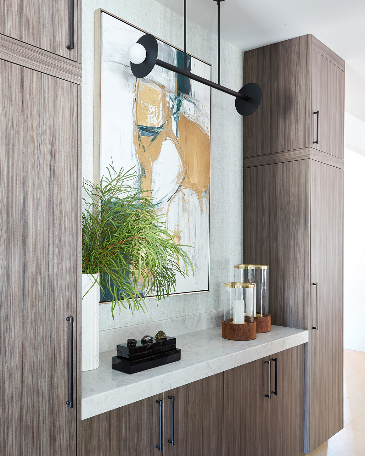 "Across from the wall ovens is a chic "landing station" for hot items, flanked by the kitchen's pantries," explained Kennedy. "Glazed linen wallpaper in a soft green serves as a backdrop for the original artwork. The Kelly Wearstler light fixture adds a chic punctuation mark."