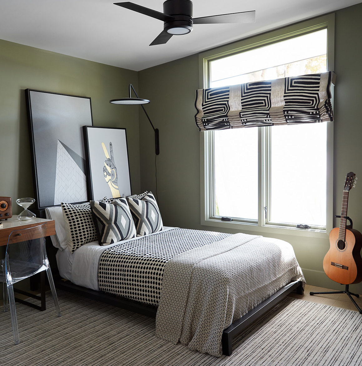 “The directive here was simple: Create a visually interesting space that is practical and private enough to allow a newly-enrolled college student to feel like an adult. Although a masculine room, a touch of gold and bronze here and there, adds style without over-designing the space,” Kelli Ellis told Aspire Design and Home.